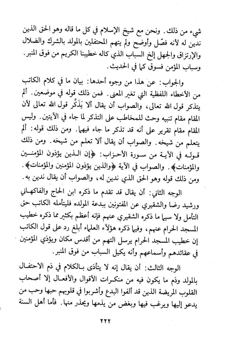 الوجه الثاني: أن يقال قد تقدم ما ذكره ابن الحاج والفاكهاني ورشيد رضا والشقيري عن المفتونين ببدعة المولده فليتأمله الكاتب حق التأمل ولاسيما ما ذكره الشقيري عنهم فإنه أعظم بكثير مما ذكره خطيب المسجد الحرام عنهم, وفيما ذكره هؤلاء العلماء أبلغ رد على قول الكاتب إن خطيب المسجد الحرام يرسل التهم من أقدس مكان ويؤذي المؤمنين في عقائدهم وأسماعهم وأنه يكيل السباب من فوق المنبر.