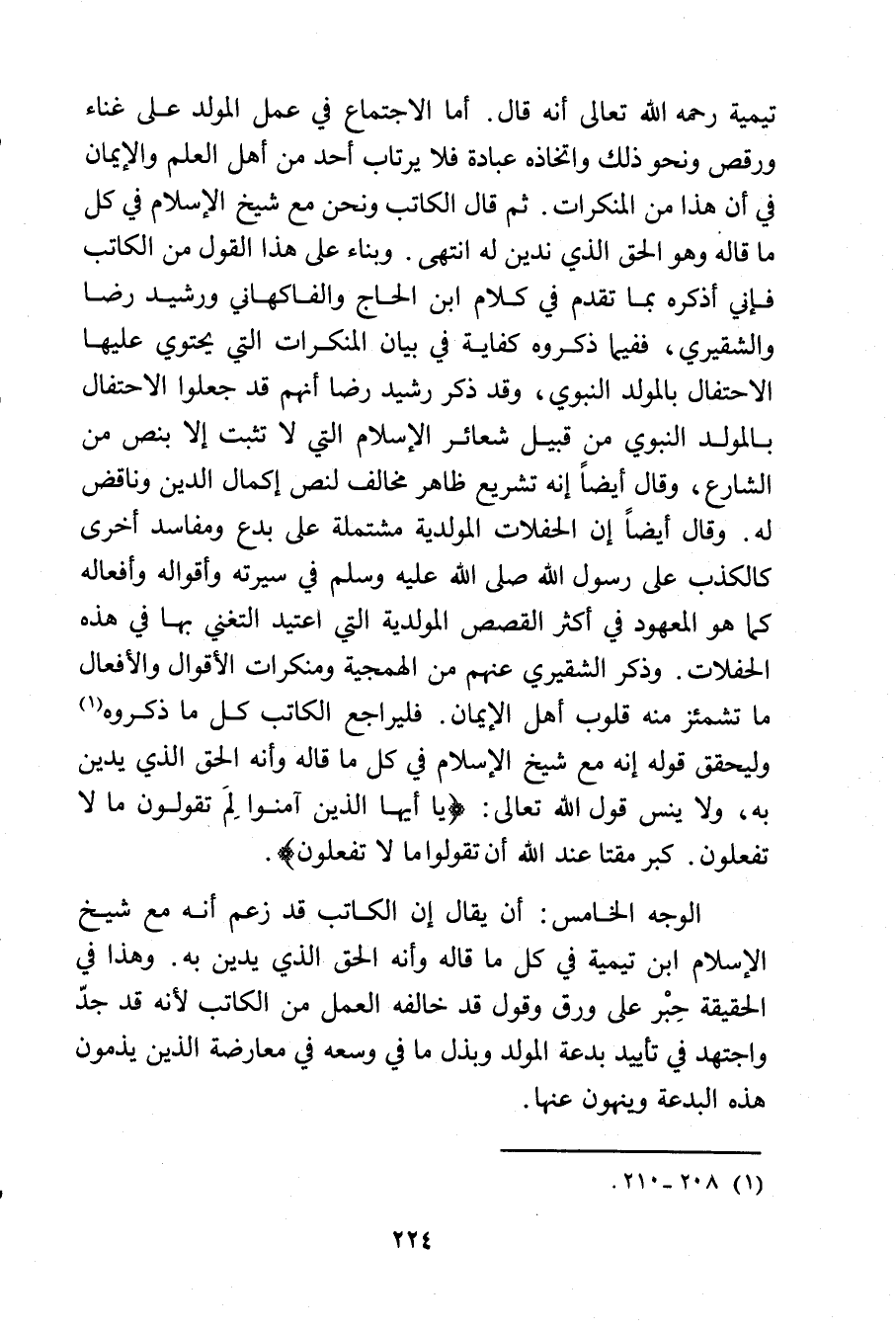 الوجه الخامس: أن يقال إن الكاتب قد زعم أنه مع شيخ الإسلام ابن تيمية في كل ما قاله وأنه الحق الذي يدين به. وهذا في الحقيقة حِبْر على ورق وقول قد خالفه العمل من الكاتب لأنه قد جدّ واجتهد في تأييد بدعة المولد وبذل ما في وسعه في معارضة الذين يذمون هذه البدعة وينهون عنها.