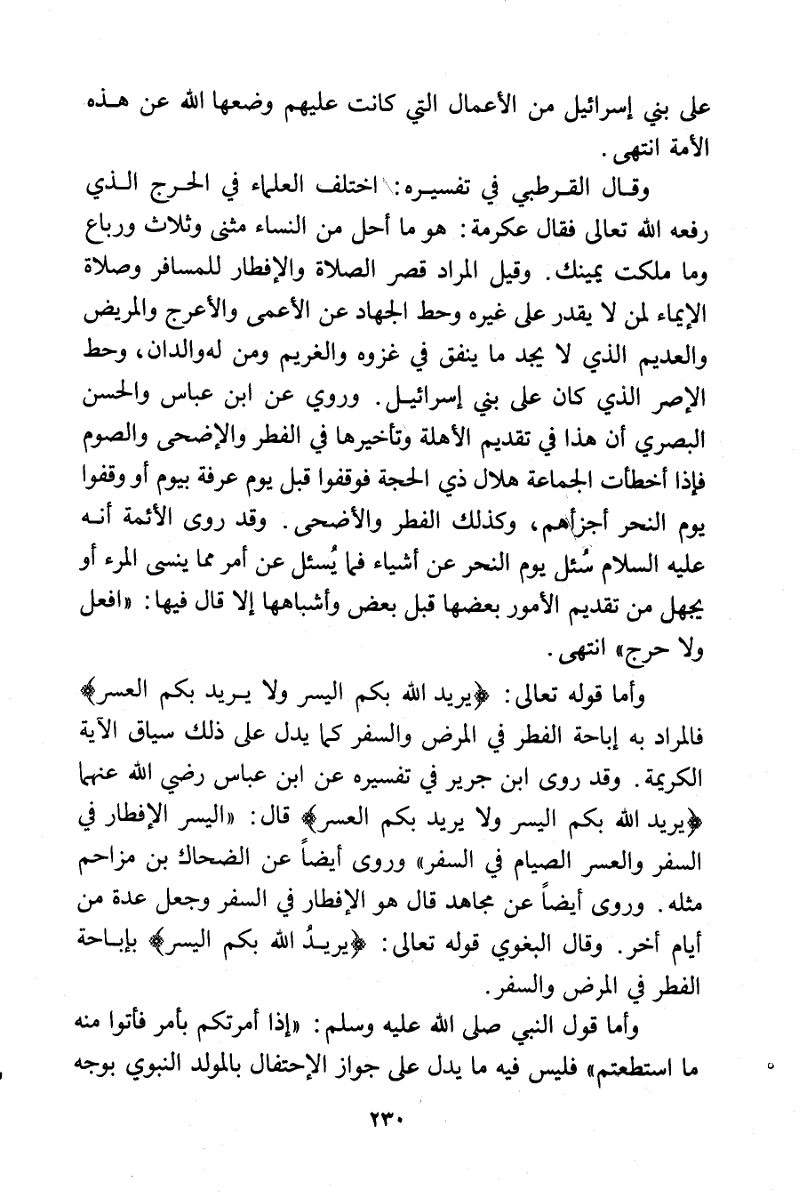 وقال القرطبي في تفسيره: اختلف العلماء في الحرج الذي رفعه الله تعالى فقال عكرمة: هو ما أحل من النساء مثنى وثلاث ورباع وما ملكت يمينك. وقيل المراد قصر الصلاة والإفطار للمسافر وصلاة الإيماء لمن لا يقدر على غيره وحط الجهاد عن الأعمى والأعرج والمريض والعديم الذي لا يجد ما ينفق في غزوه والغريم ومن له والدان, وحط الإصر الذي كان على بني إسرائيل. وروي عن ابن عباس والحسن البصري أنه هذا في تقديم الأهلة وتأخيرها في الفطر والأضحى والصوم فإذا أخطأت الجماعة هلال ذي الحجة فوقفوا قبل يوم عرفة بيوم أو وقفوا يوم النحر أجزأهم, وكذلك الفطر والأضحى. وقد روى الأئمة أنه عليه السلام سُئل يوم النحر عن أشياء فما يُسئل عن أمر مما ينسى المرء أو يجهل من تقديم الأمور بعضها قبل بعض وأشباهها إلا قال فيها: «افعل ولا حرج» انتهى.