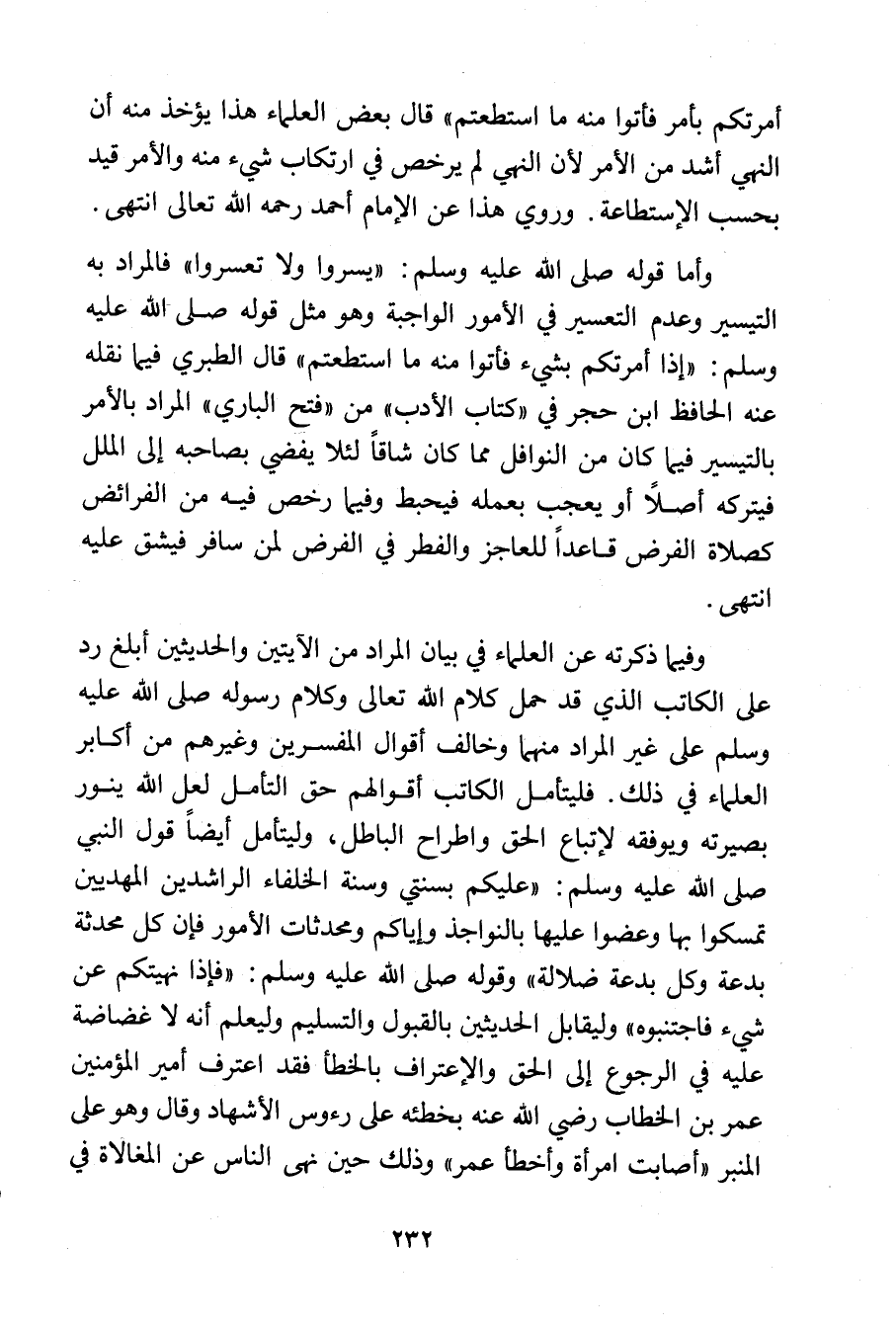 أمرتكم بأمر فأتوا منه ما استطعتم» قال بعض العلماء هذا يؤخذ منه أن النهي أشد من الأمر لأن النهي لم يرخص في ارتكاب شيء منه والأمر قيد بحسب الاستطاعة. وروي هذا عن الإمام أحمد رحمه الله تعالى انتهى.