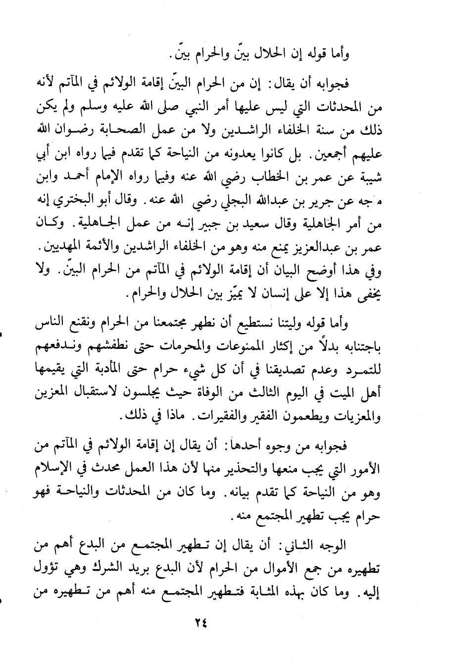 فجوابه أن يقال: إن من الحرام البيّن إقامة الولائم في المآتم لأنه من المحدثات التي ليس عليها أمر النبي - صلى الله عليه وسلم - ولم يكن ذلك من سنة الخلفاء الراشدين ولا من عمل الصحابة رضوان الله عليهم أجمعين. بل كانوا يعدونه من النياحة كما تقدم فيما رواه ابن أبي شيبة عن عمر بن الخطاب رضي الله عنه وفيما رواه الإمام أحمد وابن ماجه عن جرير بن عبد الله البجلي رضي الله عنه. وقال أبو البختري إنه من أمر الجاهلية وقال سعيد بن جبير إنه من عمل الجاهلية. وكان عمر بن عبد العزيز يمنع منه وهو من الخلفاء الراشدين والأئمة المهديين. وفي هذا أوضح البيان أن إقامة الولائم في المآتم من الحرام البيّن. ولا يخفى هذا إلا على إنسان لا يميّز بين الحلال والحرام.