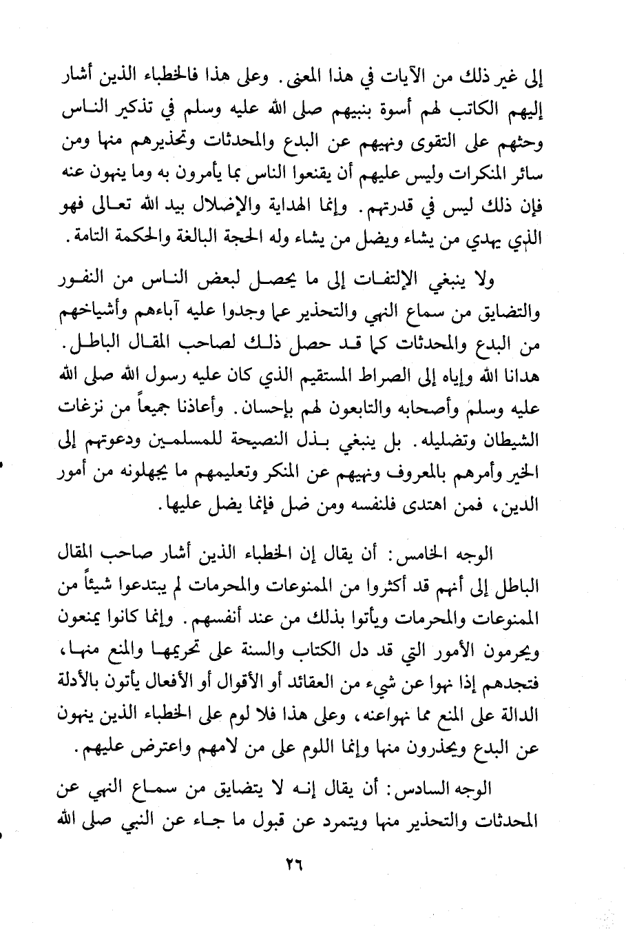 الوجه الخامس: أن يقال إن الخطباء الذين أشار صاحب المقال الباطل إلى أنهم قد أكثروا من الممنوعات والمحرمات لم يبتدعوا شيئاً من الممنوعات والمحرمات ويأتوا بذلك من عند أنفسهم. وإنما كانوا يمنعون ويحرمون الأمور التي قد دل الكتاب والسنة على تحريمها والمنع منها, فتجدهم إذا نهوا عن شيء من العقائد أو الأقوال أو الأفعال يأتون بالأدلة الدالة على المنع مما نهوا عنه, وعلى هذا فلا لوم على الخطباء الذين ينهون عن البدع ويحذرون منها وإنما اللوم على من لامهم واعترض عليهم.