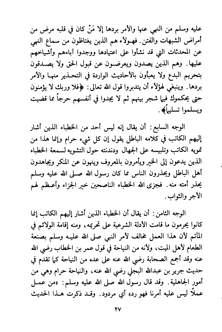 الوجه الثامن: أن يقال أن الخطباء الذين أشار إليهم الكاتب إنما كانوا يحرمون ما قامت الأدلة الشرعية على تحريمه, ومنه إقامة الولائم في المآتم لأن هذا العمل مخالف لأمر النبي - صلى الله عليه وسلم - بصنعة الطعام لأهل البيت, ولأنه من النياحة في قول عمر بن الخطاب رضي الله عنه وقد أجمع الصحابة رضي الله عنه على عده من النياحة كما تقدم في حديث جرير بن عبد الله البجلي رضي الله عنه, والنياحة حرام وهي من أمور الجاهلية. وقد قال رسول الله - صلى الله عليه وسلم -: «من عمل عملاً ليس عليه أمرنا فهو رد» أي مردود. وقد ذكرت هذا الحديث