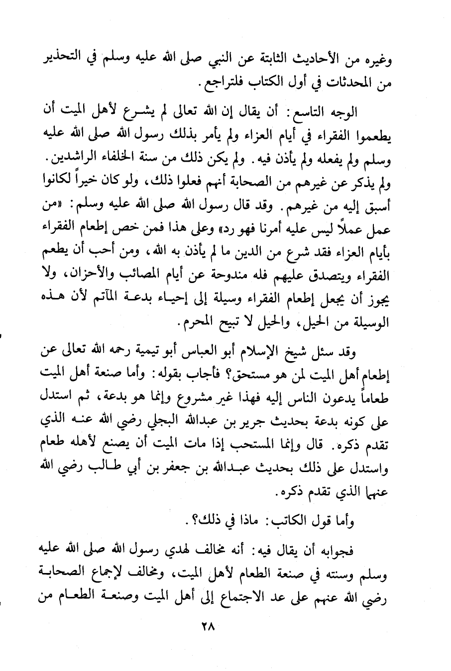 الوجه التاسع: أن يقال إن الله تعالى لم يشرع لأهل الميت أن يطعموا الفقراء في أيام العزاء ولم يأمر بذلك رسول الله - صلى الله عليه وسلم - ولم يفعله ولم يأذن فيه. ولم يكن ذلك من سنة الخلفاء الراشدين. ولم يذكر عن غيرهم من الصحابة أنهم فعلوا ذلك, ولو كان خيراً لكانوا أسبق إليه من غيرهم. وقد قال رسول الله - صلى الله عليه وسلم -: «من عمل عملاً ليس عليه أمرنا فهو رد» وعلى هذا فمن خص إطعام الفقراء بأيام العزاء فقد شرع من الدين ما لم يأذن به الله, ومن أحب أن يطعم الفقراء ويتصدق عليهم فله مندوحة عن أيام المصائب والأحزان, ولا يجوز أن يجعل إطعام الفقراء وسيلة إلى إحياء بدعة المآتم لأن هذه الوسيلة من الحيل, والحيل لا تبيح المحرم.