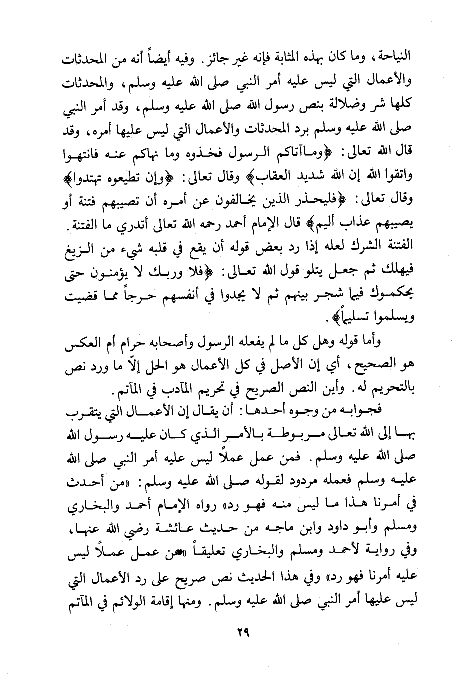 النياحة, وما كان بهذه المثابة فإنه غير جائز. وفيه أيضاً أنه من المحدثات والأعمال التي ليس عليه أمر النبي - صلى الله عليه وسلم - , والمحدثات كلها شر وضلالة بنص رسول الله - صلى الله عليه وسلم - , وقد أمر النبي - صلى الله عليه وسلم - برد المحدثات والأعمال التي ليس عليها أمره, وقد قال الله تعالى: {وما آتاكم الرسول فخذوه وما نهاكم عنه فانتهوا واتقوا الله إن الله شديد العقاب} وقال تعالى: {وإن تطيعوه تهتدوا} وقال تعالى: {فليحذر الذين يخالفون عن أمره أن تصيبهم فتنة أو يصيبهم عذاب أليم} قال الإمام أحمد رحمه الله تعالى أتدري ما الفتنة. الفتنة الشرك لعله إذا رد بعض قوله أن يقع في قلبه شيء من الزيغ فيهلك ثم جعل يتلو قول الله تعالى: {فلا وربك لا يؤمنون حتى يحكموك فيما شجر بينهم ثم لا يجدوا في أنفسهم حرجاً مما قضيت ويسلموا تسليماً}.