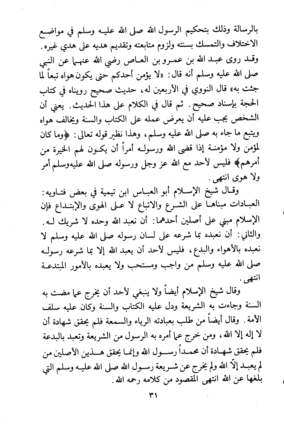 وقال شيخ الإسلام أيضاً ولا ينبغي لأحد أن يخرج عما مضت به السنة وجاءت به الشريعة ودل عليه الكتاب والسنة وكان عليه سلف الأمة. وقال أيضاً من طلب بعبادته الرياء والسمعة فلم يحقق شهادة أن لا إله إلا الله, ومن خرج عما أمره به الرسول من الشريعة وتعبد بالبدعة فلم يحقق شهادة أن محمداً رسول الله وإنما يحقق هذين الأصلين من لم يعبد إلا الله ولم يخرج عن شريعة رسول الله - صلى الله عليه وسلم - التي بلغها عن الله انتهى المقصود من كلامه رحمه الله.