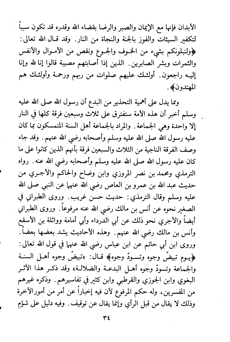 ومما يدل على أهمية التحذير من البدع أن رسول الله - صلى الله عليه وسلم - أخبر أن هذه الأمة ستفترق على ثلاث وسبعين فرقة كلها في النار إلا واحدة وهي الجماعة. والمراد بالجماعة أهل السنة المتمسكون بما كان عليه رسول الله - صلى الله عليه وسلم - وأصحابه رضي الله عنهم. وقد جاء وصف الفرقة الناجية من الثلاث والسبعين فرقة بأنهم الذين كانوا على ما كان عليه رسول الله - صلى الله عليه وسلم - وأصحابه رضي الله عنه. رواه الترمذي ومحمد بن نصر المروزي وابن وضاح والحاكم والآجري من حديث عبد الله بن عمرو بن العاص رضي الله عنهما عن النبي - صلى الله عليه وسلم - وقال الترمذي: حديث حسن غريب. وروى الطبراني في الصغير نحوه عن أنس بن مالك رضي الله عنه مرفوعاً. وروى الطبراني أيضاً والآجري نحو ذلك عن أبي الدرداء وأبي أمامة وواثلة بن الأسقع وأنس بن مالك رضي الله عنهم. وهذه الأحاديث يشد بعضها بعضاً.