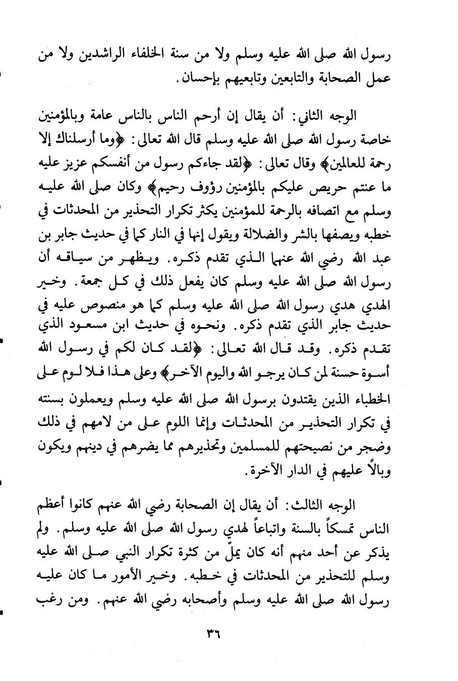 الوجه الثاني: أن يقال إن أرحم الناس بالناس عامة وبالمؤمنين خاصة رسول الله صلى الله عليه وسلم قال الله تعالى: {وما أرسلناك إلا رحمة للعالمين} وقال تعالى: {لقد جاءكم رسول من أنفسكم عزيز عليه ما عنتم حريص عليكم بالمؤمنين رؤوف رحيم} وكان - صلى الله عليه وسلم - مع اتصافه بالرحمة للمؤمنين يكثر تكرار التحذير من المحدثات في خطبه ويصفها بالشر والضلالة ويقول إنها في النار كما في حديث جابر بن عبد الله رضي الله عنهما الذي تقدم ذكره. ويظهر من سياقه أن رسول الله - صلى الله عليه وسلم - كان يفعل ذلك في كل جمعة. وخير الهدي هدي رسول الله - صلى الله عليه وسلم - كما هو منصوص عليه في حديث جابر الذي تقدم ذكره. ونحوه في حديث ابن مسعود الذي تقدم ذكره. وقد قال الله تعالى: {لقد كان لكم في رسول الله أسوة حسنة لمن كان يرجو الله واليوم الآخر} وعلى هذا فلا لوم على الخطباء الذين يقتدون برسول الله - صلى الله عليه وسلم - ويعملون بسنته في تكرار التحذير من المحدثات وإنما اللوم على من لامهم في ذلك وضجر من نصيحتهم للمسلمين وتحذيرهم مما يضرهم في دينهم ويكون وبالاً عليهم في الدار الآخرة.