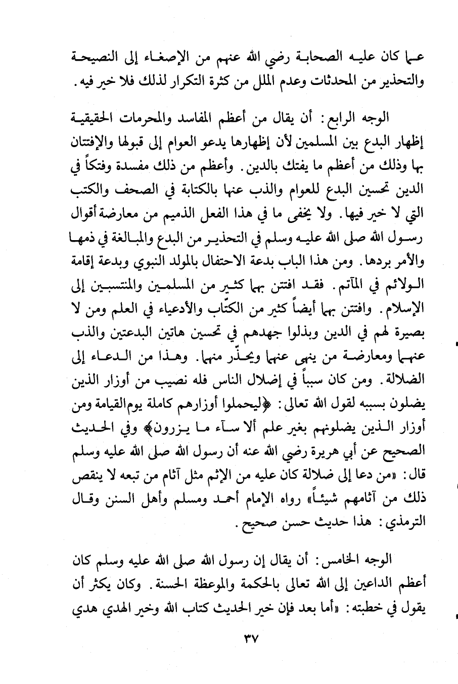 الوجه الرابع: أن يقال من أعظم المفاسد والمحرمات الحقيقية إظهار البدع بين المسلمين لأن إظهارها يدعو العوام إلى قبولها والافتتان بها وذلك من أعظم ما يفتك بالدين. وأعظم من ذلك مفسدة وفتكاً في الدين تحسين البدع للعوام والذب عنها بالكتابة في الصحف والكتب التي لا خير فيها. ولا يخفى ما في هذا الفعل الذميم من معارضة أقوال رسول الله - صلى الله عليه وسلم - في التحذير من البدع والمبالغة في ذمها والأمر بردها. من هذا الباب بدعة الاحتفال بالمولد النبوي وبدعة إقامة الولائم في المآتم. فقد افتتن بهما كثير من المسلمين والمنتسبين إلى الإسلام. وافتتن بهما أيضاً كثير من الكتّاب والأدعياء في العلم ومن لا بصيرة لهم في الدين وبذلوا جهدهم في تحسين هاتين البدعتين والذب عنهما ومعارضة من ينهى عنهما ويحذّر منهما. وهذا من الدعاء إلى الضلالة. ومن كان سبباً في إضلال الناس فله نصيب من أوزار الذين يضلون بسببه لقول الله تعالى: {ليحلموا أوزارهم كاملة يوم القيامة ومن أوزار الذين يضلونهم بغير علم ألا سآء ما يزرون} وفي الحديث الصحيح عن أبي هريرة رضي الله عنه أن رسول الله - صلى الله عليه وسلم - قال: «من دعا إلى ضلالة كان عليه من الإثم مثل آثام من تبعه لا ينقص ذلك من آثامهم شيئاً» رواه الإمام أحمد ومسلم وأهل السنن وقال الترمذي: هذا حديث حسن صحيح.