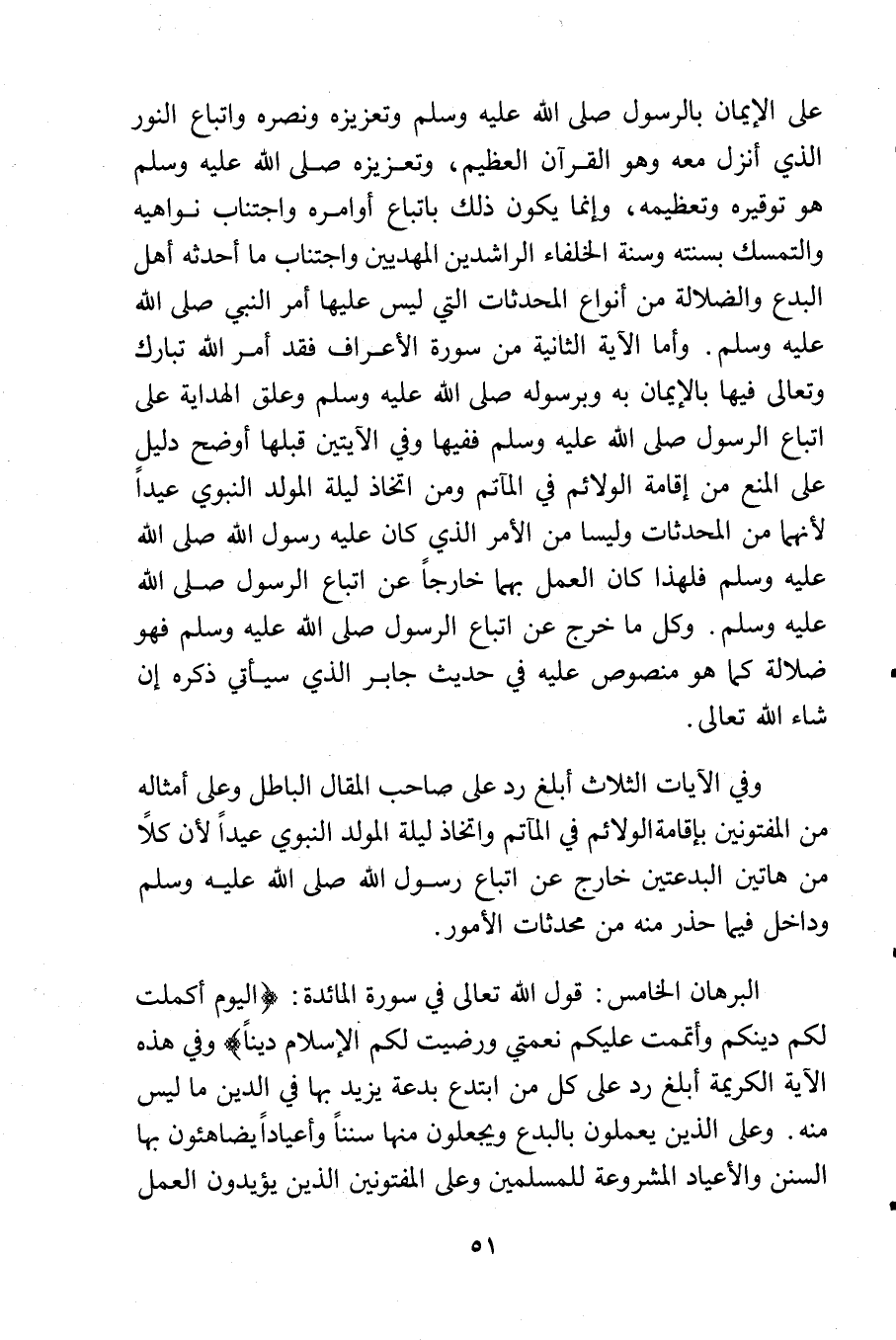 البرهان الخامس: قول الله تعالى في سورة المائدة: {اليوم أكملت لكم دينكم وأتممت عليكم نعمتي ورضيت لكم الإسلام ديناً} وفي هذه الآية الكريمة أبلغ رد على كل من ابتدع بدعة يزيد بها في الدين ما ليس منه. وعلى الذين يعملون بالبدع ويجعلون منها سنناً وأعياداً يضاهئون بها السنن والأعياد المشروعة للمسلمين وعلى المفتونين الذين يؤيدون العمل