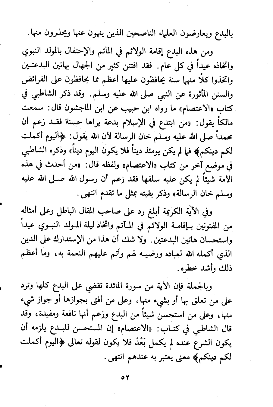 وبالجملة فإن الآية من سورة المائدة تقضي على البدع كلها وترد على من تعلق بها أو بشيء منها, وعلى من أفتى بجوازها أو جواز شيء منها, وعلى من استحسن شيئاً من البدع وزعم أنها نافعة ومفيدة, وقد قال الشاطبي في كتاب: «الاعتصام» إن المستحسن للبدع يلزمه أن يكون الشرع عنده لم يكمل بَعْدُ فلا يكون لقوله تعالى {اليوم أكملت لكم دينكم} معنى يعتبر به عندهم انتهى.