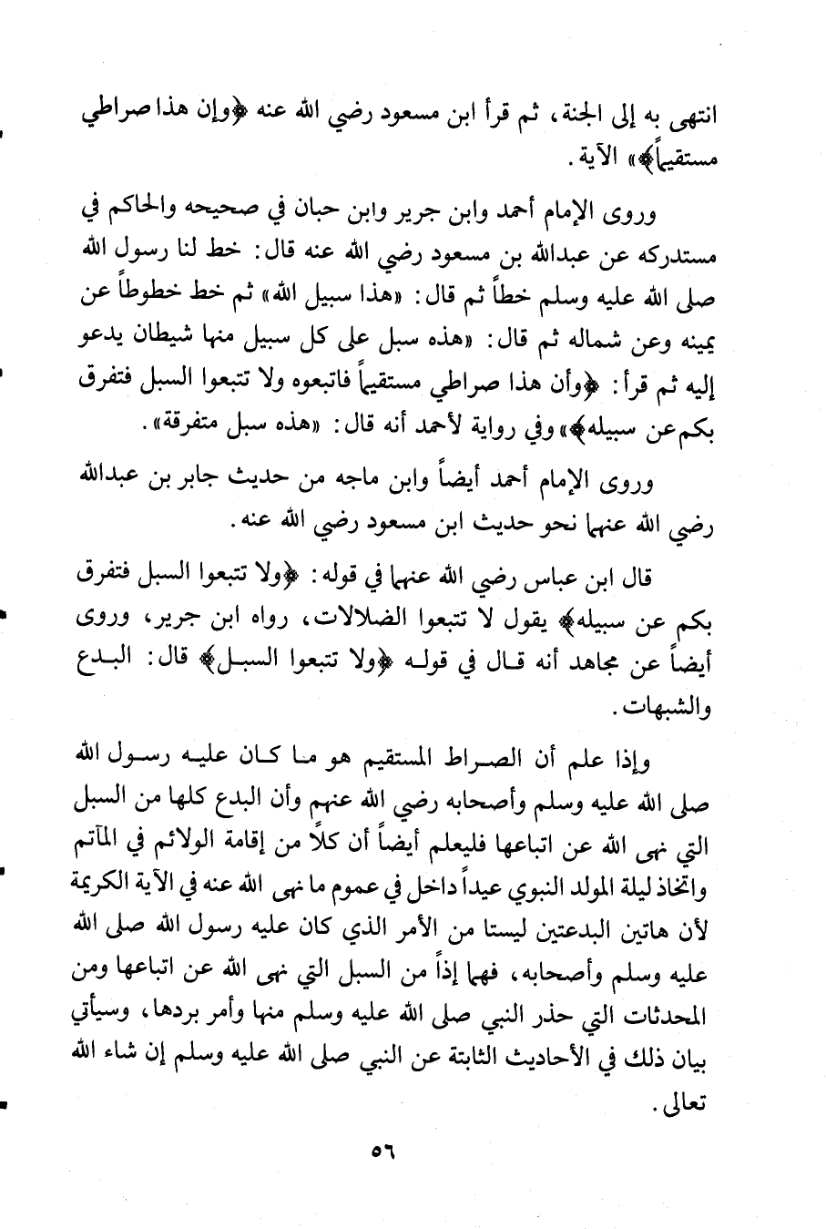 وروى الإمام أحمد وابن جرير وابن حبان في صحيحه والحاكم في مستدركه عن عبد الله بن مسعود رضي الله عنه قال: خط لنا رسول الله - صلى الله عليه وسلم - خطً ثم قال: «هذا سبيل الله» ثم خط خطوطاً عن يمينه وعن شماله ثم قال: «هذه سبل على كل سبيل منها شيطان يدعو إليه ثم قرأ: {وأن هذا صراطي مستقيماً فاتبعوه ولا تتبعوا السبل فتفرق بكم عن سبيله}» وفي رواية لأحمد أنه قال: «هذه سبل متفرقة».
