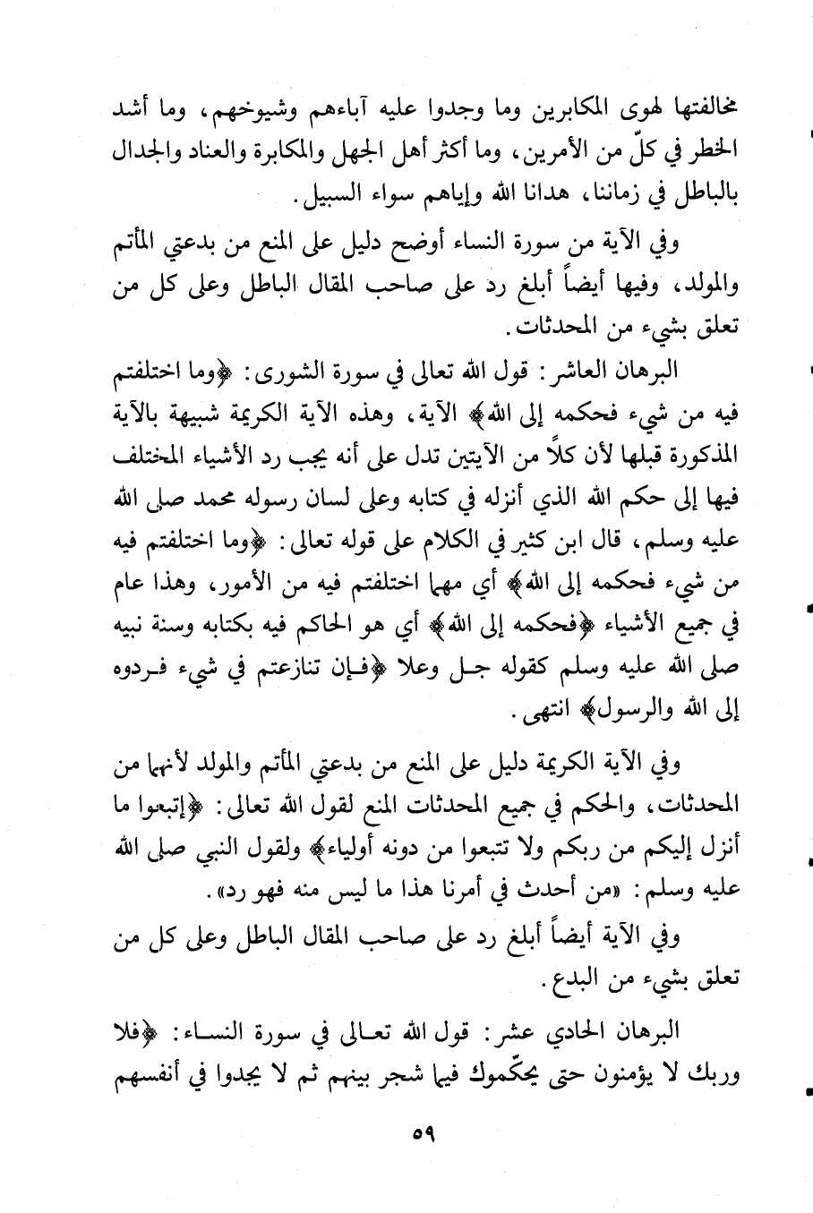 وفي الآية من سورة النساء أوضح دليل على المنع من بدعتي المأتم والمولد, وفيها أيضاً أبلغ رد على صاحب المقال الباطل وعلى كل من تعلق بشيء من المحدثات.