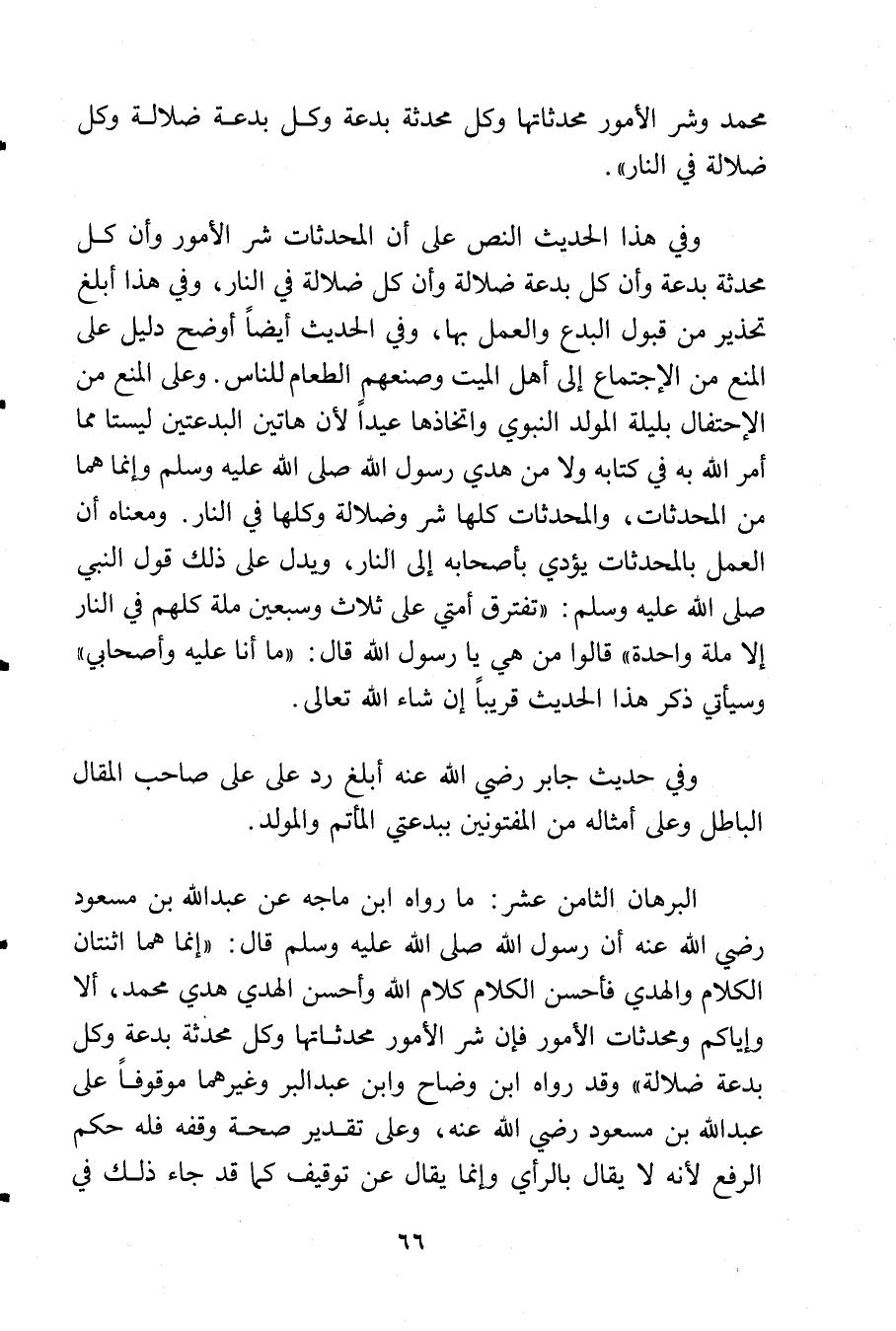 البرهان الثامن عشر: ما رواه ابن ماجه عن عبد الله بن مسعود رضي الله عنه أن رسول الله - صلى الله عليه وسلم - قال: «إنما هما اثنتان الكلام والهدي فأحسن الكلام كلام الله وأحسن الهدي هدي محمد, ألا وإياكم ومحدثات الأمور فإن شر الأمور محدثاتها وكل محدثة بدعة وكل بدعة ضلالة» وقد رواه ابن وضاح وابن عبد البر وغيرهما موقوفاً على عبد الله بن مسعود رضي الله عنه, وعلى تقدير صحة وقفه فله حكم الرفع لأنه لا يقال بالرأي وإنما يقال عن توقيف كما قد جاء ذلك في