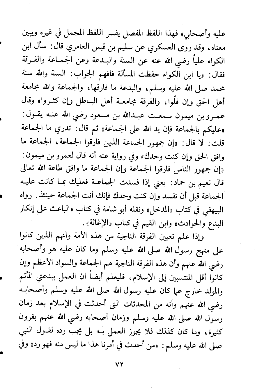 وقد جاء وصف الفرقة الناجية في بعض الأحاديث بأنهم الجماعة وجاء وصفهم في بعضها بأنهم السواد الأعظم, ولفظ الجماعة والسواد الأعظم مجمل وقد بينه - صلى الله عليه وسلم - بقوله: «من كان على ما أنا عليه وأصحابي» فهذا اللفظ المفصل يفسر اللفظ المجمل في غيره ويبين معناه, وقد روى العسكري عن سليم بن قيس العامري قال: سأل ابن الكواء علياً رضي الله عنه عن السنة والبدعة وعن الجماعة والفرقة فقال: «يا ابن الكواء حفظت المسألة فافهم الجواب: السنة والله سنة محمد - صلى الله عليه وسلم - , والبدعة ما فارقها, والجماعة والله مجامعة أهل الحق وإن قلّوا, والفرقة مجامعة أهل الباطل وإن كثروا» وقال عمرو بن ميمون سمعت عبد الله بن مسعود رضي الله عنه يقول: «عليكم بالجماعة فإن يد الله على الجماعة» ثم قال: تدري ما الجماعة قلت: لا قال: «إن جمهور الجماعة الذين فارقوا الجماعة, الجماعة ما وافق الحق وإن كنت وحدك» وفي رواية عنه أنه قال لعمرو بن ميمون: «إن جمهور الناس فارقوا الجماعة وإن الجماعة ما وافق طاعة الله تعالى قال نعيم بن حماد: يعني إذا فسدت الجماعة فعليك بما كانت عليه الجماعة قبل أن تفسد وإن كنت وحدك فإنك أنت الجماعة حينئذ. رواه البيهقي في كتاب «المدخل» ونقله أبو شامة في كتاب «الباعث على إنكار البدع والحوادث» وابن القيم في كتاب «الإغاثة».