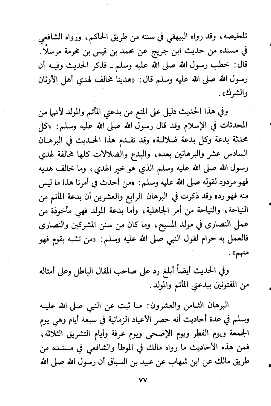 وفي هذا الحديث دليل على المنع من بدعتي المأتم والمولد لأنهما من المحدثات في الإسلام وقد قال رسول الله - صلى الله عليه وسلم -: «كل محدثة بدعة وكل بدعة ضلالة» وقد تقدم هذا الحديث في البرهان السادس عشر والبرهانين بعده, والبدع والضلالات كلها مخالفة لهدي رسول الله - صلى الله عليه وسلم - الذي هو خير الهدي, وما خالف هديه فهو مردود لقوله - صلى الله عليه وسلم -: «من أحدث في أمرنا هذا ما ليس منه فهو رد» وقد ذكرت في البرهان الرابع والعشرين أن بدعة المأتم من النياحة, والنياحة من أمر الجاهلية, وأما بدعة المولد فهي مأخوذة من عمل النصارى في مولد المسيح, وما كان من سنن المشركين والنصارى فالعمل به حرام لقول النبي - صلى الله عليه وسلم -: «من تشبه بقوم فهو منهم».