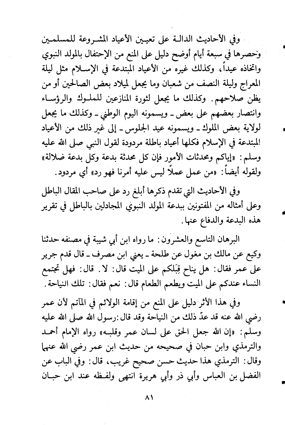 وفي الأحاديث الدالة على تعيين الأعياد المشروعة للمسلمين وحصرها في سبعة أيام أوضح دليل على المنع من الاحتفال بالمولد النبوي واتخاذه عيداً, وكذلك غيره من الأعياد المبتدعة في الإسلام مثل ليلة المعراج وليلة النصف من شعبان وما يجعل لميلاد بعض الصالحين أو من يظن صلاحهم. وكذلك ما يجعل لثورة المنازعين للملوك والرؤساء وانتصار بعضهم على بعض - ويسمونه اليوم الوطني - وكذلك ما يجعل لولاية بعض الملوك - ويسمونه عيد الجلوس - إلى غير ذلك من الأعياد المبتدعة في الإسلام فكلها أعياد باطلة مردودة لقول النبي - صلى الله عليه وسلم -: «إياكم ومحدثات الأمور فإن كل محدثة بدعة وكل بدعة ضلالة» ولقوله أيضاً: «من عمل عملاً ليس عليه أمرنا فهو رد» أي مردود.