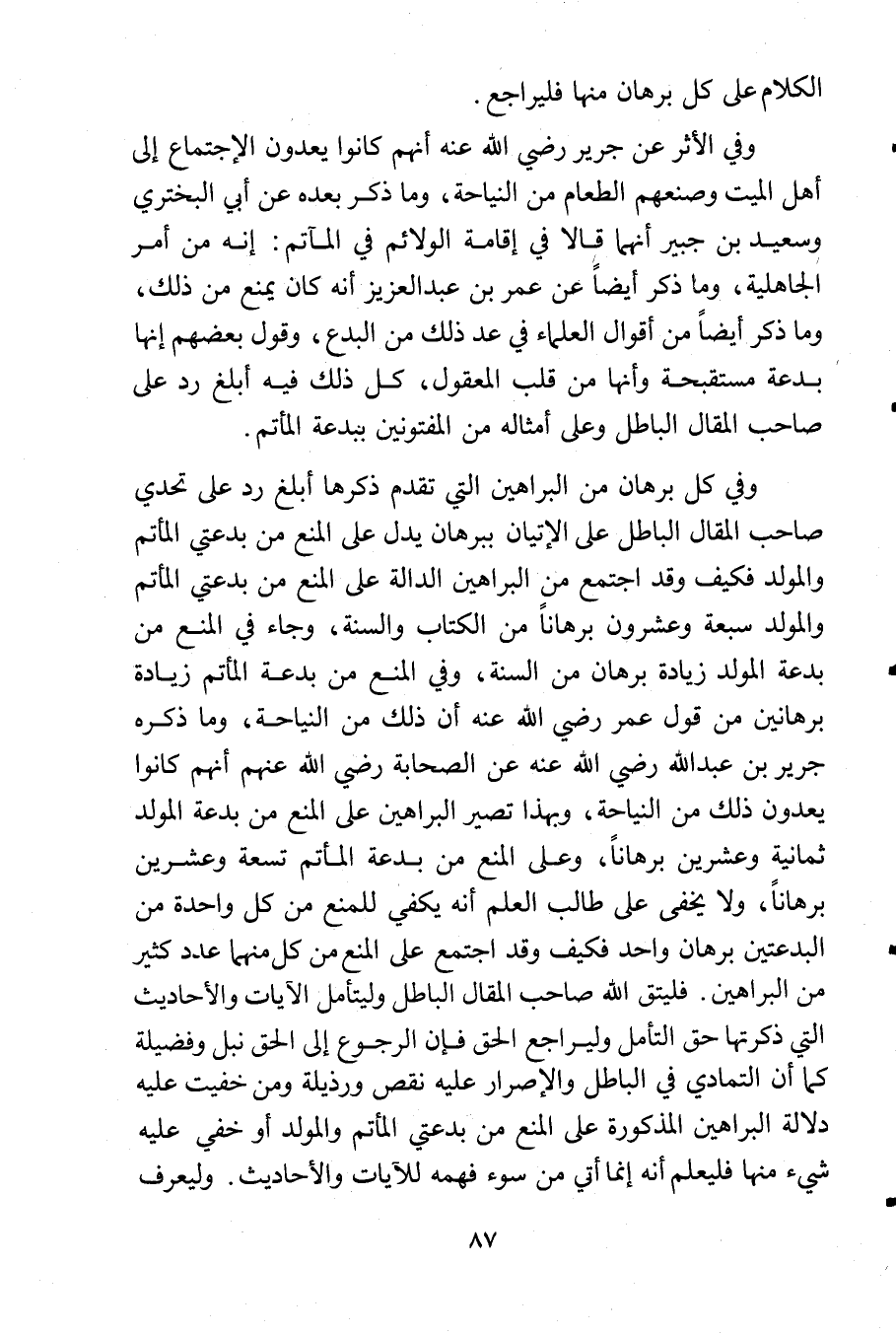 وفي الأثر عن جرير رضي الله عنه أنهم كانوا يعدون الاجتماع إلى أهل الميت وصنعهم الطعام من النياحة, وما ذكر بعده عن أبي البختري وسعيد بن جبير أنهما قالا في إقامة الولائم في المآتم: إنه من أمر الجاهلية, وما ذكر أيضاً عن عمر بن عبد العزيز أنه كان يمنع من ذلك, وما ذكر أيضاً من أقوال العلماء في عد ذلك من البدع, وقول بعضهم إنها بدعة مستقبحة وأنها من قلب المعقول, كل ذلك فيه أبلغ رد على صاحب المقال الباطل وعلى أمثاله من المفتونين ببدعة المأتم.