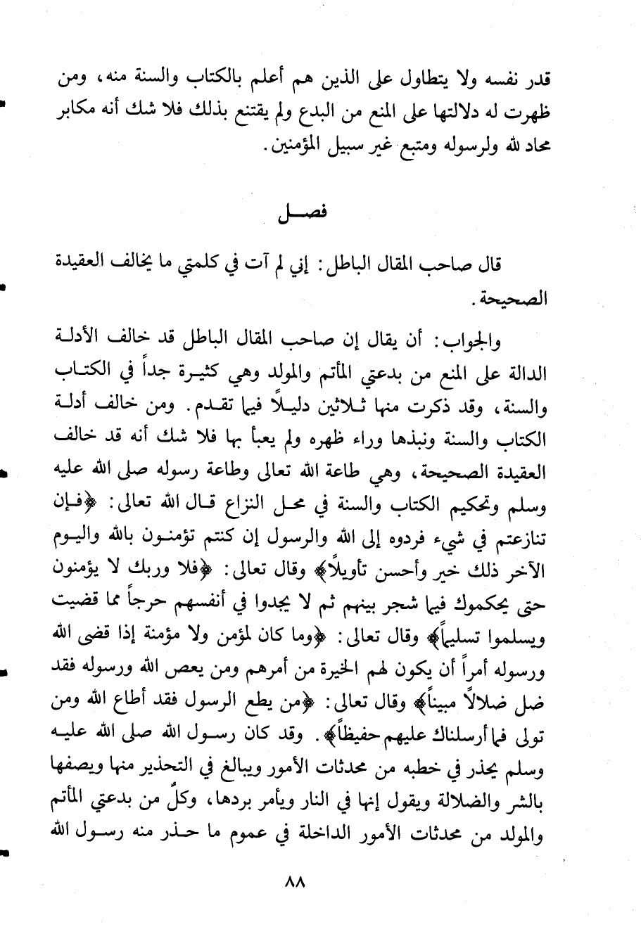 والجواب: أن يقال إن صاحب المقال الباطل قد خالف الأدلة الدالة على المنع من بدعتي المأتم والمولد وهي كثيرة جداً في الكتاب والسنة, وقد ذكرت منها ثلاثين دليلاً فيما تقدم. ومن خالف أدلة الكتاب والسنة ونبذها وراء ظهره ولم يعبأ بها فلا شك أنه قد خالف العقيدة الصحيحة, وهي طاعة الله تعالى وطاعة رسوله - صلى الله عليه وسلم - وتحكيم الكتاب والسنة في محل النزاع قال الله تعالى: {فإن تنازعتم في شيء فردوه إلى الله والرسول إن كنتم تؤمنون بالله واليوم الآخر ذلك خير وأحسن تأويلاً} وقال تعالى: {فلا وربك لا يؤمنون حتى يحكموك فيما شجر بينهم ثم لا يجدوا في أنفسهم حرجاً مما قضيت ويسلموا تسليماً} وقال تعالى: {وما كان لمؤمن ولا مؤمنة إذا قضى الله ورسوله أمراً أن يكون لهم الخيرة من أمرهم ومن يعص الله ورسوله فقد ضل ضلالاً مبيناً} وقال تعالى: {من يطع الرسول فقد أطاع الله ومن تولى فما أرسلناك عليهم حفيظاً}. وقد كان رسول الله - صلى الله عليه وسلم - يحذر في خطبه من محدثات الأمور ويبالغ في التحذير منها ويصفها بالشر والضلالة ويقول إنها في النار ويأمر بردها, وكل من بدعتي المأتم والمولد من محدثاتها الأمور الداخلة في عموم ما حذر منه رسول الله