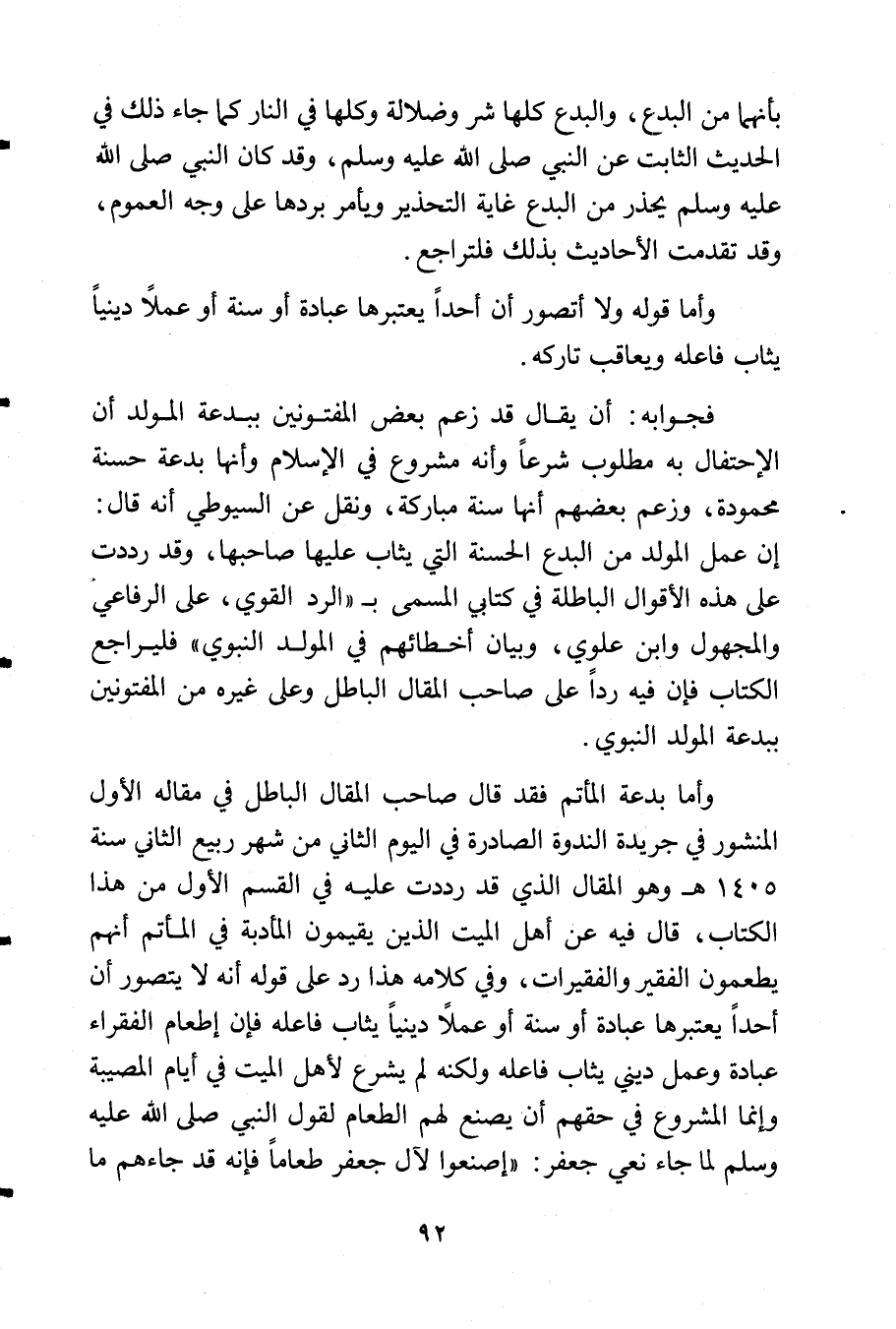 وأما بدعة المأتم فقد قال صاحب المقال الباطل في مقاله الأول المنشور في جريدة الندوة الصادرة في اليوم الثاني من شهر ربيع الثاني سنة 1405 هـ وهو المقال الذي قد رددت عليه في القسم الأول من هذا الكتاب, قال فيه عن أهل الميت الذين يقيمون المأدبة في المأتم أنهم يطعمون الفقير والفقيرات, وفي كلامه هذا رد على قوله أنه لا يتصور أن أحداً يعتبرها عبادة أو سنة أو عملاً دينياً يثاب فاعله فإن إطعام الفقراء عبادة وعمل ديني يثاب فاعله ولكنه لم يشرع لأهل الميت في أيام المصيبة وإنما المشروع في حقهم أن يصنع لهم الطعام لقول النبي - صلى الله عليه وسلم - لما جاء نعي جعفر: «اصنعوا لآل جعفر طعاما فإنه قد جاءهم ما