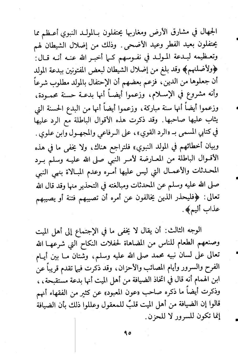 الجهال في مشارق الأرض ومغاربها يحتفلون بالمولد النبوي أعظم مما يحتفلون بعيد الفطر وعيد الأضحى. وذلك من إضلال الشيطان لهم وتعظيمه لبدعة المولد في نفوسهم كما أخبر الله عنه أنه قال: {ولأضلنهم} وقد بلغ من إضلال الشيطان لبعض المفتونين ببدعة المولد أن جعلوها من الدين, فزعم بعضهم أن الاحتفال بالمولد مطلوب شرعاً وأنه مشروع في الإسلام, وزعموا أيضاً أنها بدعة حسنة محمودة, وزعموا أيضاً أنها سنة مباركة, وزعموا أيضاً أنها من البدع الحسنة التي يثاب عليها صاحبها. وقد ذكرت هذه الأقوال الباطلة مع الرد عليها في كتابي المسمى بـ «الرد القوي» , على الرفاعي والمجهول وابن علوي. وبيان أخطائهم في المولد النبوي» فلتراجع هناك, ولا يخفى ما في هذه الأقوال الباطلة من المعارضة لأمر النبي - صلى الله عليه وسلم - برد المحدثات والأعمال التي ليس عليها أمره وعدم المبالاة بنهي النبي - صلى الله عليه وسلم - عن المحدثات ومبالغته في التحذير منها وقد قال الله تعالى: {فليحذر الذين يخالفون عن أمره أن تصيبهم فتنة أو يصيبهم عذاب أليم}.