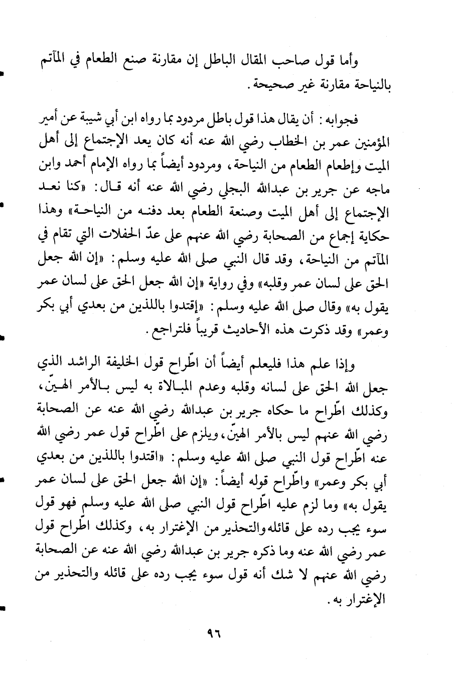 فجوابه: أن يقال هذا قول باطل مردود بما رواه ابن أ [ي شيبة عن أمير المؤمنين عمر بن الخطاب رضي الله عنه أنه كان يعد الاجتماع إلى أهل الميت وإطعام الطعام من النياحة, ومردود أيضاً بما رواه الإمام أحمد وابن ماجه عن جرير بن عبد الله البجلي رضي الله عنه أنه قال: «كنا نعد الاجتماع إلى أهل الميت وصنعة الطعام بعد دفنه من النياحة» وهذا حكاية إجماع من الصحابة رضي الله عنهم على عدّ الحفلات التي تقام في المآتم من النياحة, وقد قال النبي - صلى الله عليه وسلم -: «إن الله جعل الحق على لسان عمر وقلبه» وفي رواية «إن الله جعل الحق على لسان عمر يقول به» وقال - صلى الله عليه وسلم -: «اقتدوا باللذين من بعدي أبي بكر وعمر» وقد ذكرت هذه الأحاديث قريباً فلتراجع.