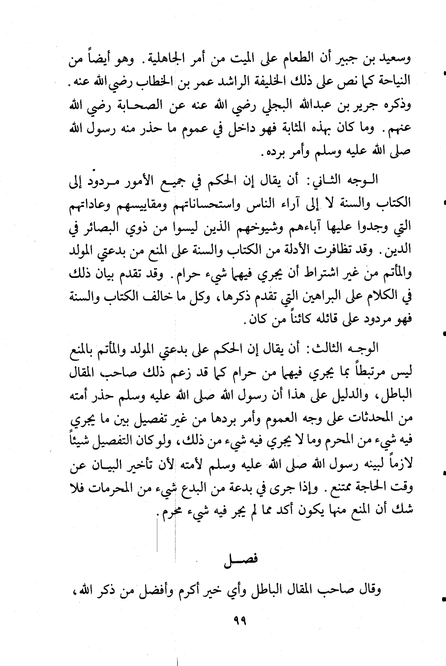 الوجه الثالث: أن يقال إن الحكم على بدعتي المولد والمأتم بالمنع ليس مرتبطاً بما يجري فيهما من حرام كما قد زعم ذلك صاحب المقال الباطل, والدليل على هذا أن رسول الله - صلى الله عليه وسلم - حذر أمته من المحدثات على وجه العموم وأمر بردها من غير تفصيل بين ما يجري فيه شيء من المحرم وما لا يجري فيه شيء من ذلك, ولو كان التفصيل شيئاً لازماً لبنيه رسول الله - صلى الله عليه وسلم - لأمته لأن تأخير البيان عن وقت الحاجة ممتنع. وإذا جرى في بدعة من البدع شيء من المحرمات فلا شك أن المنع منها يكون أكد مما لم يجر فيه شيء محرم.