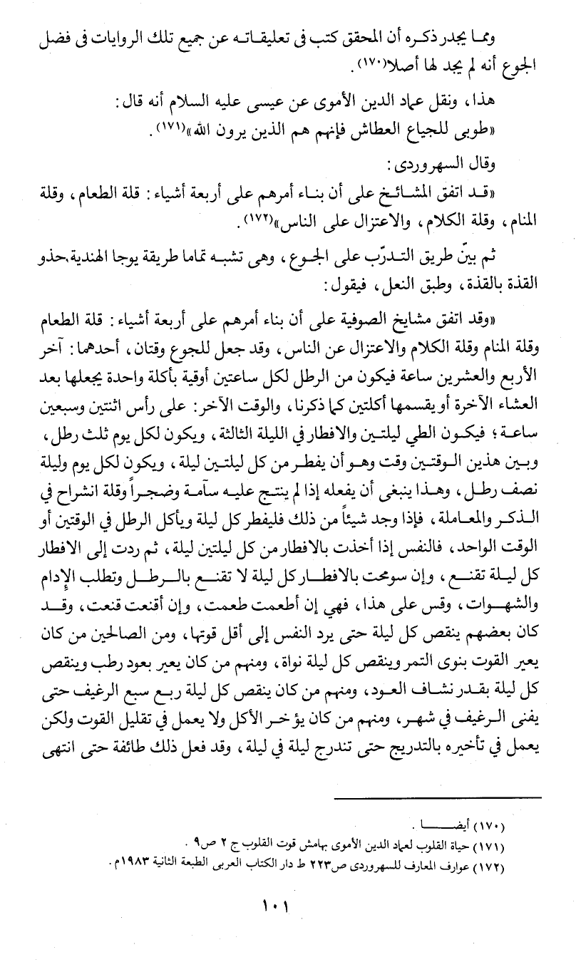 (وقد اتفق مشايخ الصوفية على أن بناء أمرهم على أربعة أشياء: قلة الطعام وقلة المنام وقلة الكلام والاعتزال عن الناس , وقد جعل للجوع وقتان , أحدهما: آخر الأربع والعشرين ساعة فيكون من الرطل لكل ساعتين أوقية بأكلة واحدة يجعلها بعد العشاء الآخرة أو يقسمها أكلتين , كما ذكرنا , والوقت الآخر: على رأس اثنتين وسبعين ساعة , فيكون الطي ليلتين والإفطار في الليلة الثالثة , ويكون لكل يوم ثلث رطل , وبين هذين الوقتين وقت وهو أن يفطر من كل ليلتين ليلة , ويكون لكل يوم وليلة نصف رطل , وهذا ينبغي أن يفعله إذا لم ينتج عليه سآمة وضجراً وقلة انشراح في الذكر والمعاملة , فإذا وجد شيئا من ذلك فليفطر كل ليلة ويأكل الرطل في الوقتين أو في الوقت الواحد , فالنفس إذا أخذت بالإفطار من كل ليلتين ليلة , ثم ردت إلى الإفطار كل ليلة تقنع , وإن سومحت بالإفطار كل ليلة لا تقنع بالرطل وتطلب الإدام والشهوات , وقس على هذا , فهي إن أطمعت طمعت , وإن أقنعت قنعت , وقد كان بعضهم ينقص كل ليلة بقدر نشاف العود , ومنهم من كان ينقص كل ليلة ربع سبع الرغيف حتى يفنى الرغيف في شهر , ومنهم من كان يؤخر الأكل ولا يعمل في تقليل القوت ولكن يعمل في تأخيره بالتدريج حتى تندرج ليلة في ليلة , وقد فعل ذلك طائفة حتى انتهى