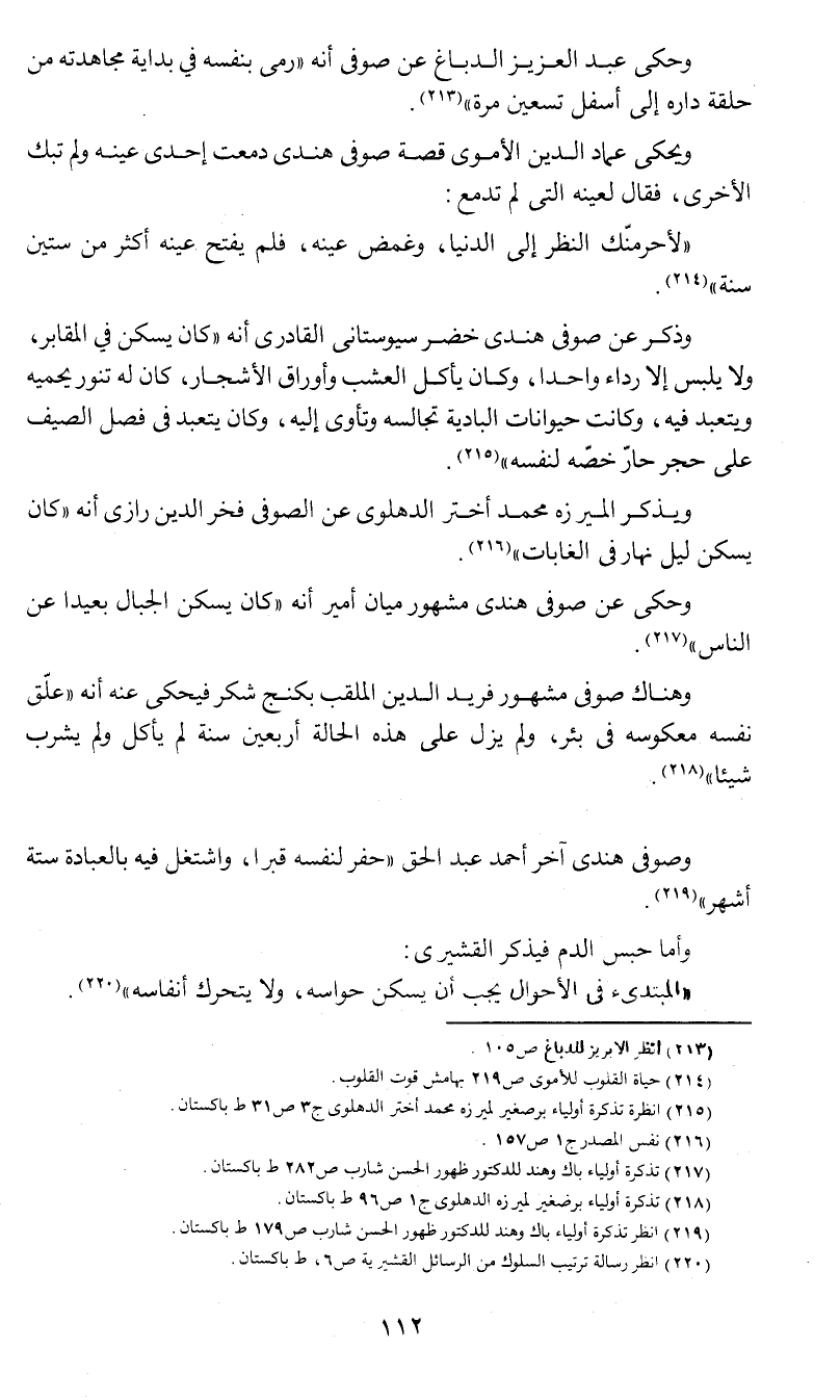 وذكر عن صوفي هندي خضر سيوستاني القادري أنه (كان يسكن في المقابر , ولا يلبس إلا رداء واحدا , وكان يأكل العشب وأوراق الأشجار , كان له تنور يحميه ويتعبد فيه , وكانت حيوانات البادية تجالسه وتأوي إليه , وكان يتعبد في فصل الصيف على حجر حارّ خصّه لنفسه) (¬3).
