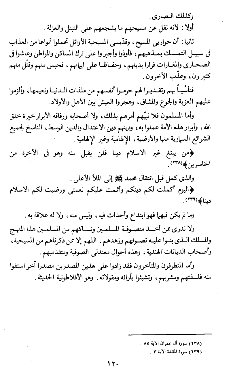 وأما المسلمون فلا نبيّهم أمرهم بذلك , ولا أصحابه ورفاقه الأبرار خيرة خلق الله , وأبرار هذه الأمة عملوا به , ودينهم دين الاعتدال والدين الوسط , الناسخ لجميع الشرائع السماوية منها والأرضية , الإلهامية وغير الإلهامية.