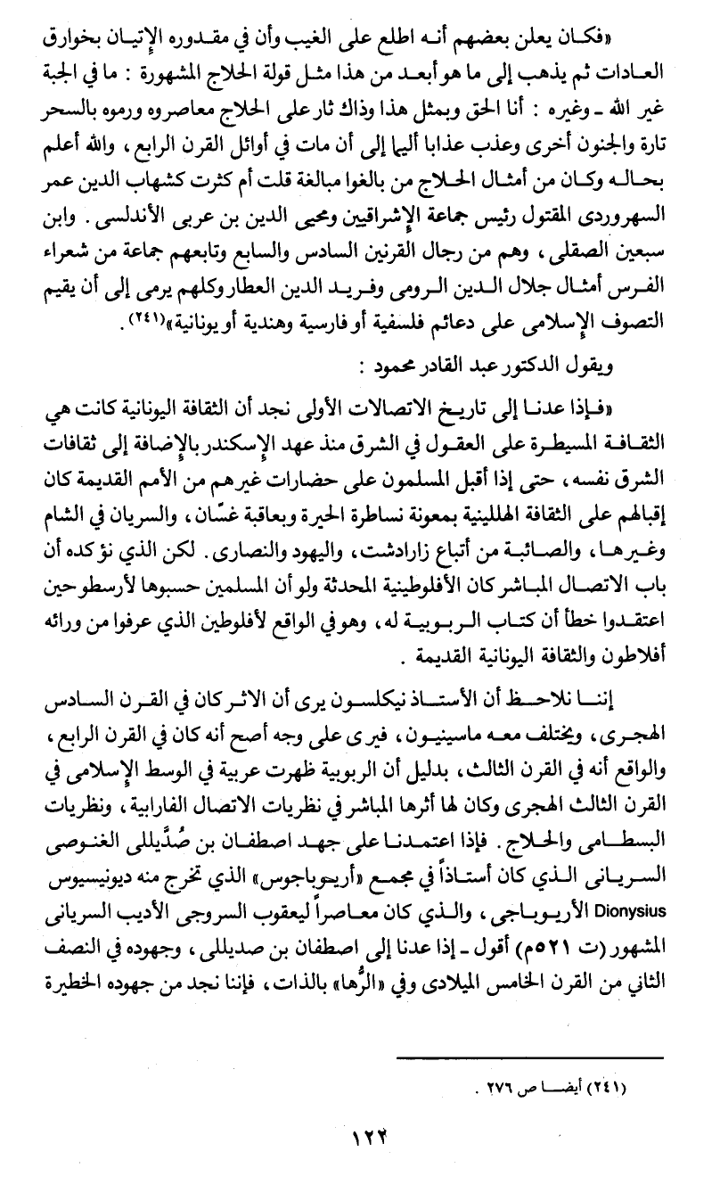 (فإذا عدنا إلى تاريخ الاتصالات الأولى نجد أن الثقافة اليونانية كانت هي الثقافة المسيطرة على العقول في الشرق منذ عهد الإسكندر بالإضافة إلى ثقافات الشرق نفسه , حتى إذا أقبل المسلمون على حضارات غيرهم من الأمم القديمة كان إقبالهم على الثقافة الهللينية بمعونة نساطرة الحيرة وبمعاقبة غسّان , والسريان في الشام وغيرها , والصابئة من أتباع زرادشت , واليهود والنصارى. لكن الذي نؤكده أن باب الاتصال المباشر كان الأفلوطينية المحدثة ولو أن المسلمين حسبوها لأرسطو حين اعتقدوا خطأ أن كتاب الربوبية له , وهو في الواقع لأفلوطين الذي عرفوا من ورائه أفلاطون والثقافة اليونانية القديمة.