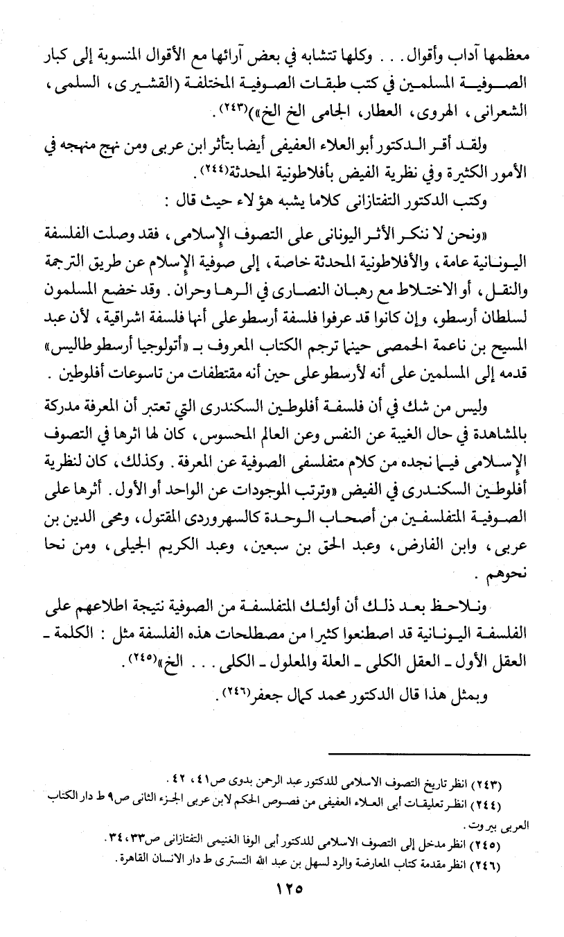ولقد أقر الدكتور أبو العلاء العفيفي أيضا بتأثر ابن عربي ومن نهج منهجه في الأمور الكثيرة وفي نظرية الفيض بأفلاطونية المحدثة (¬2).