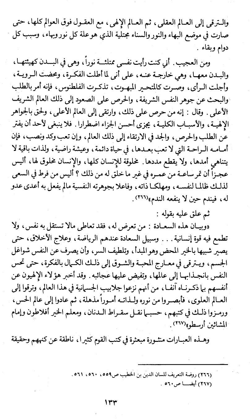 (وبيان هذه السعادة: من تعرض له , فقد تعاطى ما لا يستقل به نفس , ولا تطمع فيه قوة ... وسبيل السعادة عندهم الرياضة , وعلاج الأخلاق , حتى يصير شيبها بالخير المحض وهو المبدأ , وتلطيف السر , وأن يصرف عن النفس شواغل الجسم , ويترقى في معارج المحبة والشوق إلى ذلك الكمال بالفكرة , حتى تحس النفس بانجذابها إلى عالمها , وتفيض عليها عجائبه. وقد أخبر هؤلاء الإلهيون عن أنفسهم عن أنفسهم بما ذكرناه آنفا , من أنهم نزعوا جلابيب الجسمانية في هذا العالم , وترقوا إلى العالم العلوي , فأبصروا من نوره ولذاته أموراً مذهلة , ثم عادوا إلى عالم الحس , ورمزوا ذلك في كتبهم , حسبما نقل سقراط الدنان , ومعلم الخير أفلاطون وإمام المشائين أرسطو) (¬2).