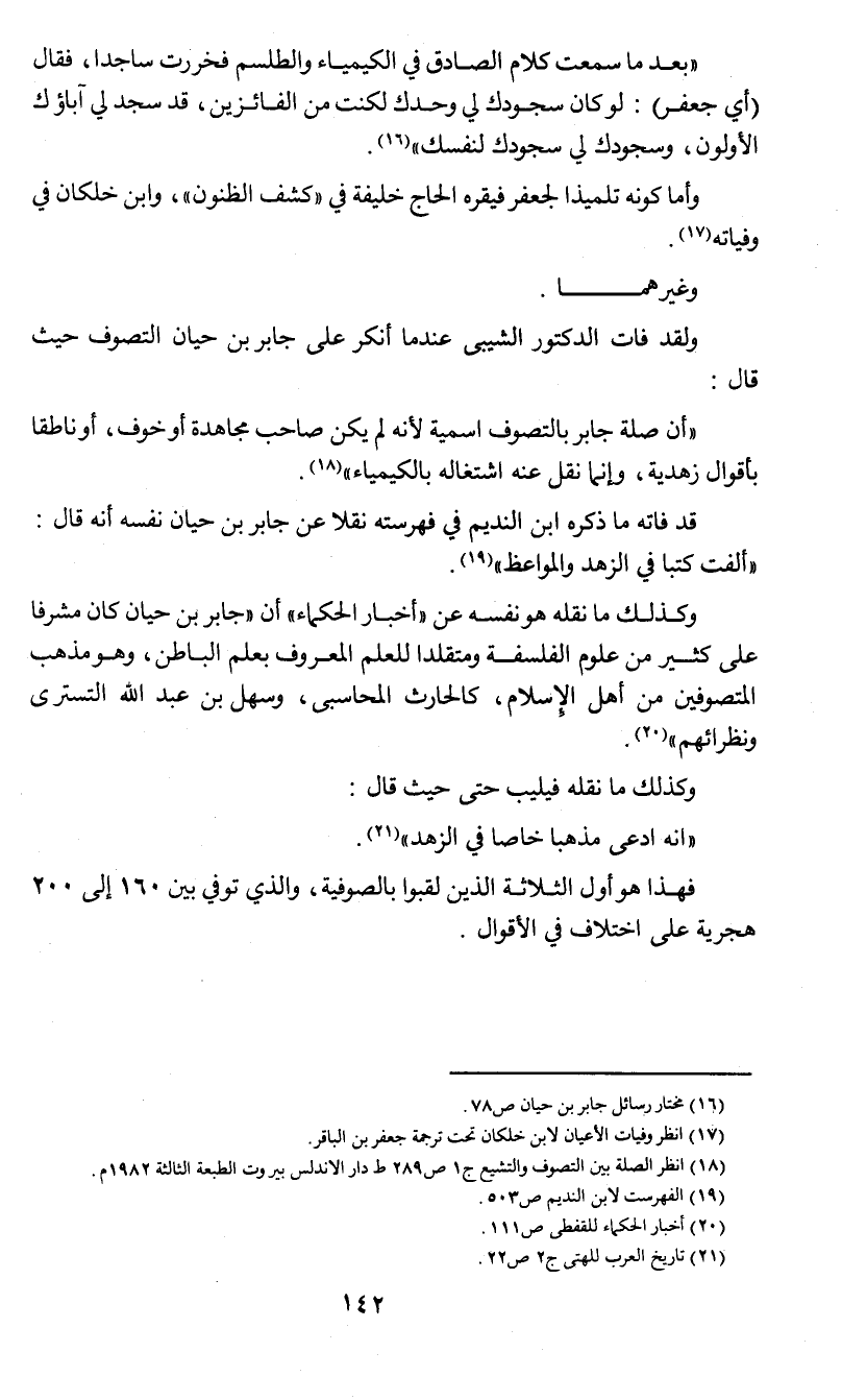 وكذلك ما نقله هو نفسه عن (أخبار الحكماء) أن (جابر بن حيان كان مشرفا على كثير من علوم الفلسفة ومتقلدا للعلم المعروف بعلم الباطن , وهو مذهب المتصوفين من أهل الإسلام , كالحارث المحاسبي , وسهل بن عبد الله التستري ونظرائهم) (¬5).