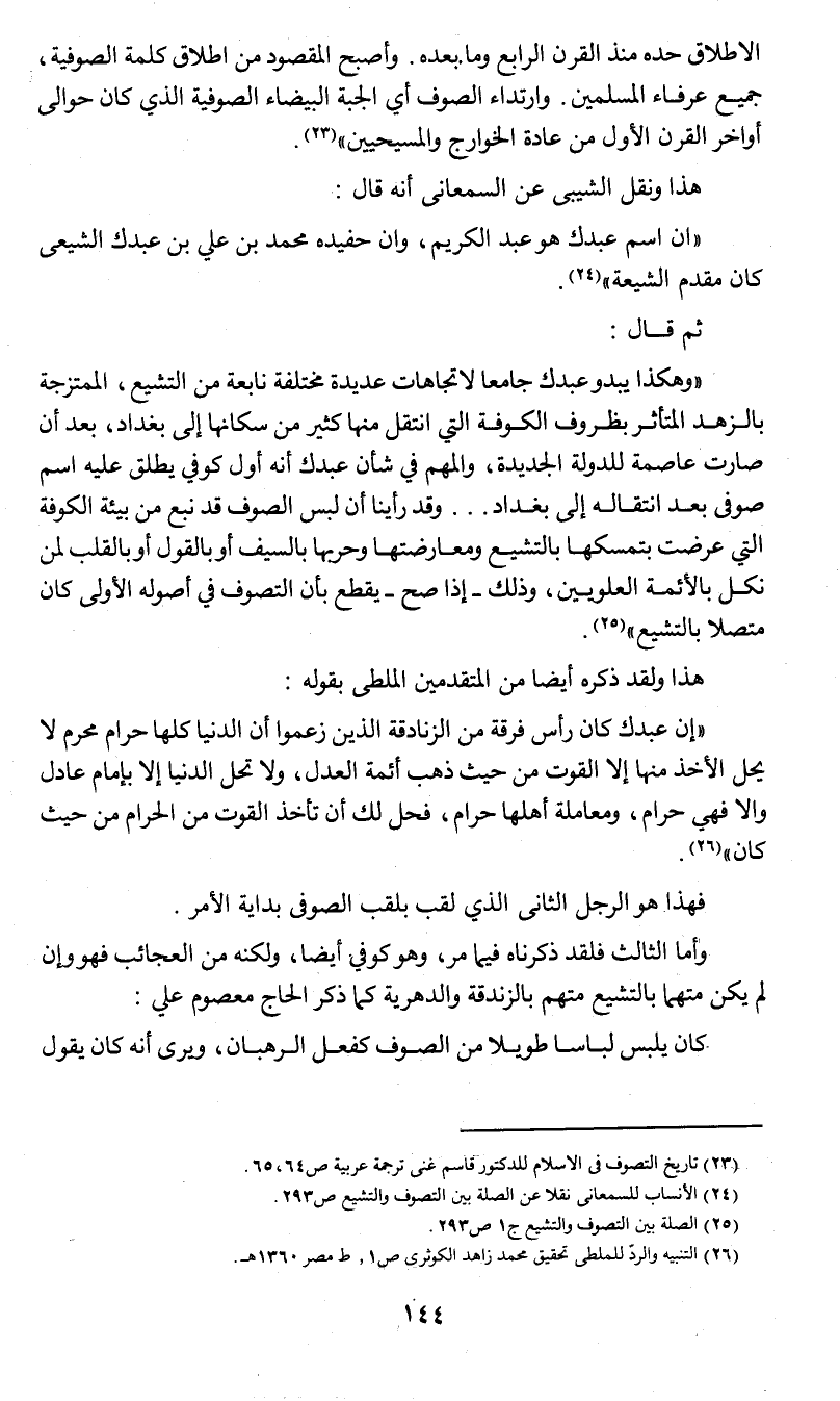 (وهكذا يبدو عبدك جامعا لاتجاهات عديدة مختلفة نابعة من التشيع , الممتزجة بالزهد المتأثر بظروف الكوفة التي انتقل منها كثير من سكانها إلى بغداد , بعد أن صارت عاصمة للدولة الجديدة , والمهم في شأن عبدك أنه أول كوفي يطلق عليه اسم صوفي بعد انتقاله إلى بغداد ... وقد رأينا أن لبس الصوف قد نبع من بيئة الكوفة التي عرفت بتمسكها بالتشيع ومعارضتها وحربها بالسيف أو بالقول أو بالقلب لمن نكل بالأئمة العلويين , وذلك - إذا صح - يقطع بأن التصوف في أصوله الأولى كان متصلا بالتشيع) (¬3).