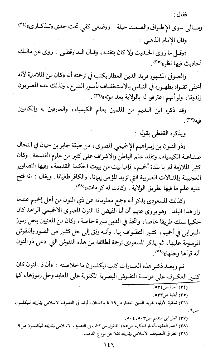 (ذو النون بن إبراهيم الإخميمي المصري , من طبقة جابر بن حيان في انتحال صناعة الكيمياء , وتقلد علم الباطن والإشراف على كثير من علوم الفلسفة. وكان كثير الملازمة لبر با بلدة إخميم , فإنها بيت من بيوت الحكمة القديمة , وفيها التصاوير العجيبة والمثالات الغريبة التي تزيد المؤمن إيمانا , والكافر طغيانا. ويقال: أنه فتح عليه علم ما فيها بطريق الولاية. وكانت له كرامات) (¬5).