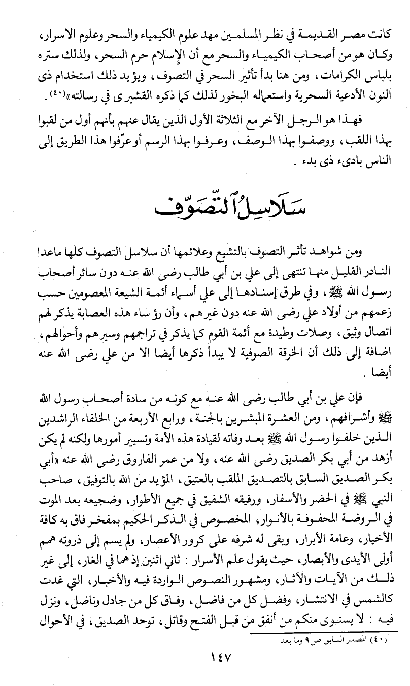 ومن شواهد تأثر التصوف بالتشيع وعلمائها أن سلاسل التصوف كلها ما عدا النادر القليل منها تنتهي إلى علي بن أبي طالب رضي الله عنه دون سائر أصحاب رسول الله صلى الله عليه وسلم , وفي طرق إسنادها إلى علي أسماء أئمة الشيعة المعصومين حسب زعمهم من أولاد علي رضي الله عنه دون غيرهم , وأن رؤساء هذه العصابة يذكر لهم اتصال وثيق , وصلات وطيدة مع أئمة القوم كما يذكر في تراجمهم وسيرهم وأحوالهم , إضافة إلى ذلك أن الخرقة الصوفية لا يبدأ ذكرها أيضا إلا من علي رضي الله عنه أيضا.