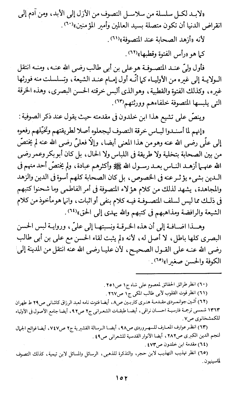 (ولابد لكل سلسلة من سلاسل التصوف من الأزل إلى الأبد , ومن آدم إلى انقراض الدنيا أن تكون متصلة بسيد العالمين وأمير المؤمنين) (¬1).