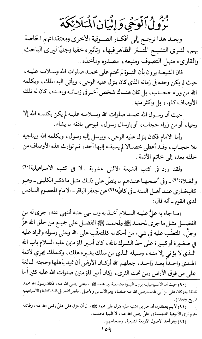 وأما الإمام فكان ينزل عليه الوحي , ويرسل إليه رسول , ويكلمه الله ويناجيه بلا حجاب , وقد أعطى خصالا لم يسبقه إليها أحد , ثم توارث هذه الأوصاف من خلفه بعده إلى خاتم الأئمة.