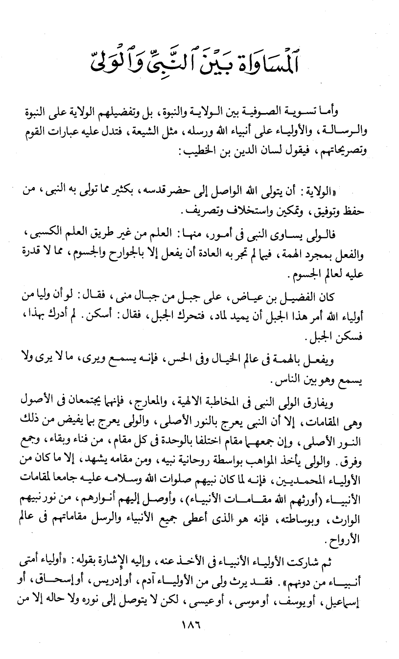وأما تسوية الصوفية بين الولاية والنبوة , بل وتفضيلهم الولاية على النبوة والرسالة , والأولياء على أنبياء الله ورسله , مثل الشيعة , فتدل عليه عبارات القوم وتصريحاتهم , فيقول لسان الدين ابن الخطيب: