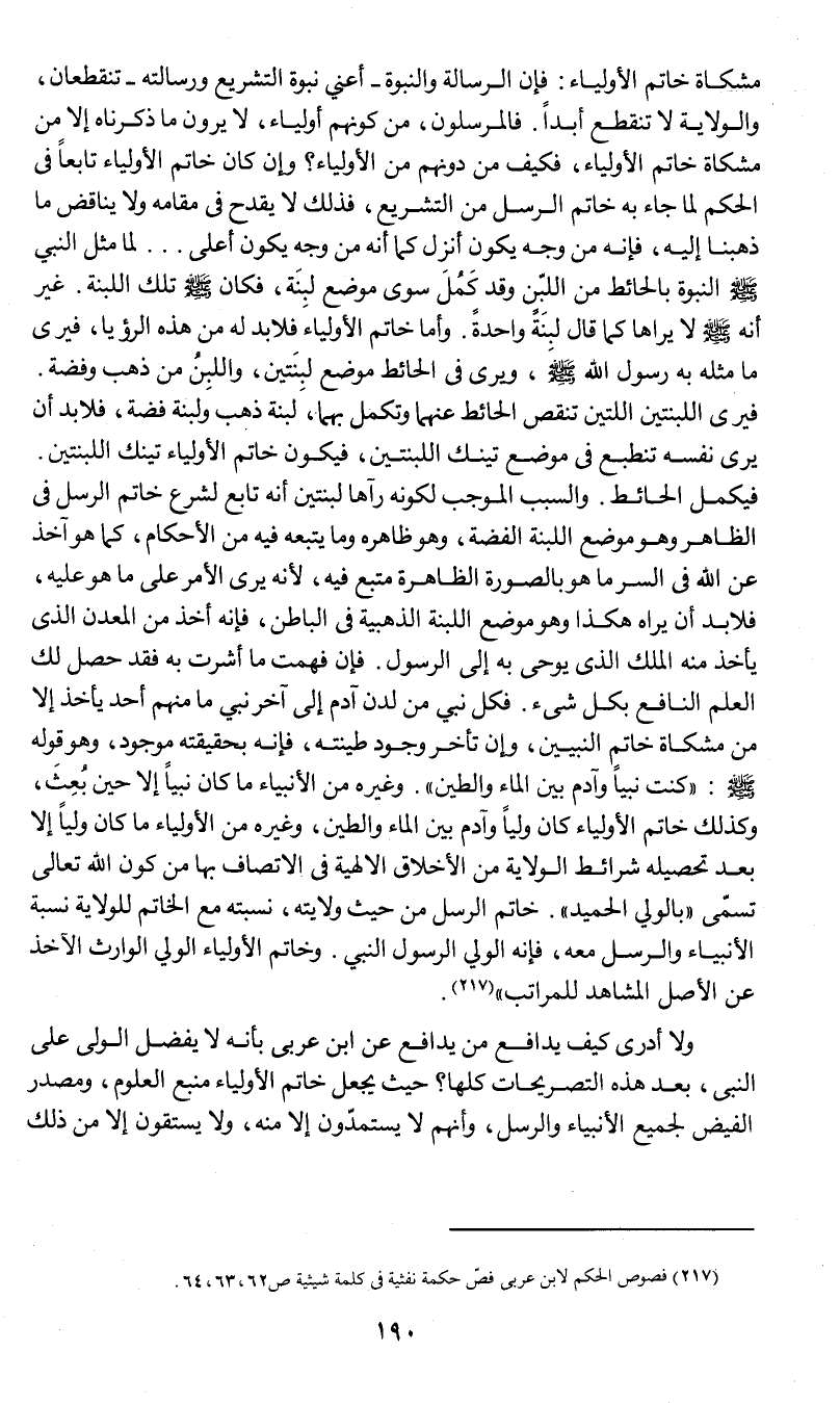 مشكاة خاتم الأولياء: فإن الرسالة والنبوة - أعني نبوة التشريع ورسالته - تنقطعان , والولاية لا تنقطع أبداً. فالمرسلون , من كونهم أولياء , لا يرون ما ذكرناه إلا من مشكاة خاتم الأولياء , فكيف من دونهم من الأولياء؟ وإن كان خاتم الأولياء تابعا في الحكم لما جاء به خاتم الرسل من التشريع , فذلك لا يقدح في مقامه ولا يناقض ما ذهبنا إليه , فإنه من وجه يكون أنزل كما أنه من وجه يكون أعلى ... لما مثل النبي صلى الله عليه وسلم النبوة بالحائط من اللبّن وقد كَمُلَ سوى موضع لبِنَة , فكان صلى الله عليه وسلم تلك اللبنة. غير أنه صلى الله عليه وسلم لا يراها كما قال لبِنَة واحدة. وأما خاتم الأولياء فلا بد له من هذه الرؤيا , فيرى ما مثله به رسول الله صلى الله عليه وسلم , ويرى في الحائط موضع لبِنَتين , واللبن من ذهب وفضة. فيرى اللبنتين اللتين تنقص الحائط عنهما وتكمل بهما , لبنة ذهب ولبنة فضة , فلا بد أن يرى نفسه تنطبع في موضع تينك اللبنتين , فيكون خاتم الأولياء تينك اللبنتين. فيكمل الحائط. والسبب الموجب لكونه رآها لبنتين أنه تابع لشرع خاتم الرسل في الظاهر وهو موضع اللبنة الفضة , وهو ظاهره وما يتبعه فيه من الأحكام , كما هو آخذ عن الله في السر ما هو موضع اللبنة الذهبية في الباطن , فإنه أخذ من المعدن الذي يأخذ من الملك الذي يوحى به إلى الرسول .. فإن فهمت ما أشرت به فقد حصل لك العلم النافع بكل شيء. فكل نبي من لدن آدم إلى آخر نبي ما منهم أحد يأخذ إلا من مشكاة خاتم النبيين , وإن تأخر وجود طينته , فإنه بحقيقته موجود , وهو قوله صلى الله عليه وسلم: (كنت نبياً وآدم بين الماء والطين). وغيره من الأنبياء ما كان نبيا إلا حين بُعثَ , وكذلك خاتم الأولياء كان وليا وآدم بين الماء والطين , وغيره من الأولياء ما كان ولياً إلا بعد تحصيله شرائط الولاية من الأخلاق الإلهية في الاتصاف بها من كون الله تعالى تسمى (بالولي الحميد). خاتم الرسل من حيث ولايته , نسبته مع الخاتم للولاية نسبة الأنبياء والرسل معه , فإنه الولي الرسول النبي. وخاتم الأولياء الولي الوارث الآخذ عن ألأصل المشاهد للمراتب) (¬1).