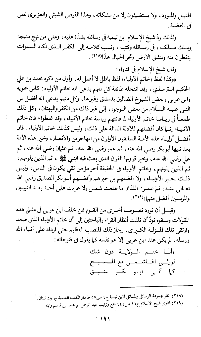 (وكذا لفظ (خاتم الأولياء) لفظ باطل لا أصل له , وأول من ذكره محمد بن علي الحكيم الترمذي , وقد انتحله طائفة كل منهم يدعي أنه خاتم الأولياء: كابن حمويه وابن عربي وبعض الشيوخ الضالين بدمشق وغيرها , وكل منهم يدعي أنه أفضل من النبي عليه السلام من بعض الوجوه , إلى غير ذلك من الكفر والبهتان , وكل ذلك طمعاً في رياسة خاتم الأولياء لما فاتتهم رياسة خاتم الأنبياء , وقد غلطوا , فإن خاتم الأنبياء إنما كان أفضلهم للأدلة الدالة على ذلك , وليس كذلك خاتم الأولياء. فإن أفضل أولياء هذه الأمة السابقون الأولون من المهاجرين والأنصار , وخير هذه الأمة بعد نبيها أبو بكر رضي الله عنه , ثم عمر رضي الله عنه وثم عثمان رضي الله عنه , ثم علي رضي الله عنه , وخير قرونها القرن الذي بعث فيه النبي صلى الله عليه وسلم , ثم الذين يلونهم , ثم الذين يلونهم , وخاتم الأولياء في الحقيقة آخر مؤمن تقي يكون في الناس , وليس ذلك بخير الأولياء , ولا أفضلهم بل خيرهم وأفضلهم أبو بكر الصديق رضي الله عنه تعالى عنه , ثم عمر: اللذان ما طلعت شمس ولا غربت على أحد بعد النبيين والمرسلين أفضل منهما) (¬2).