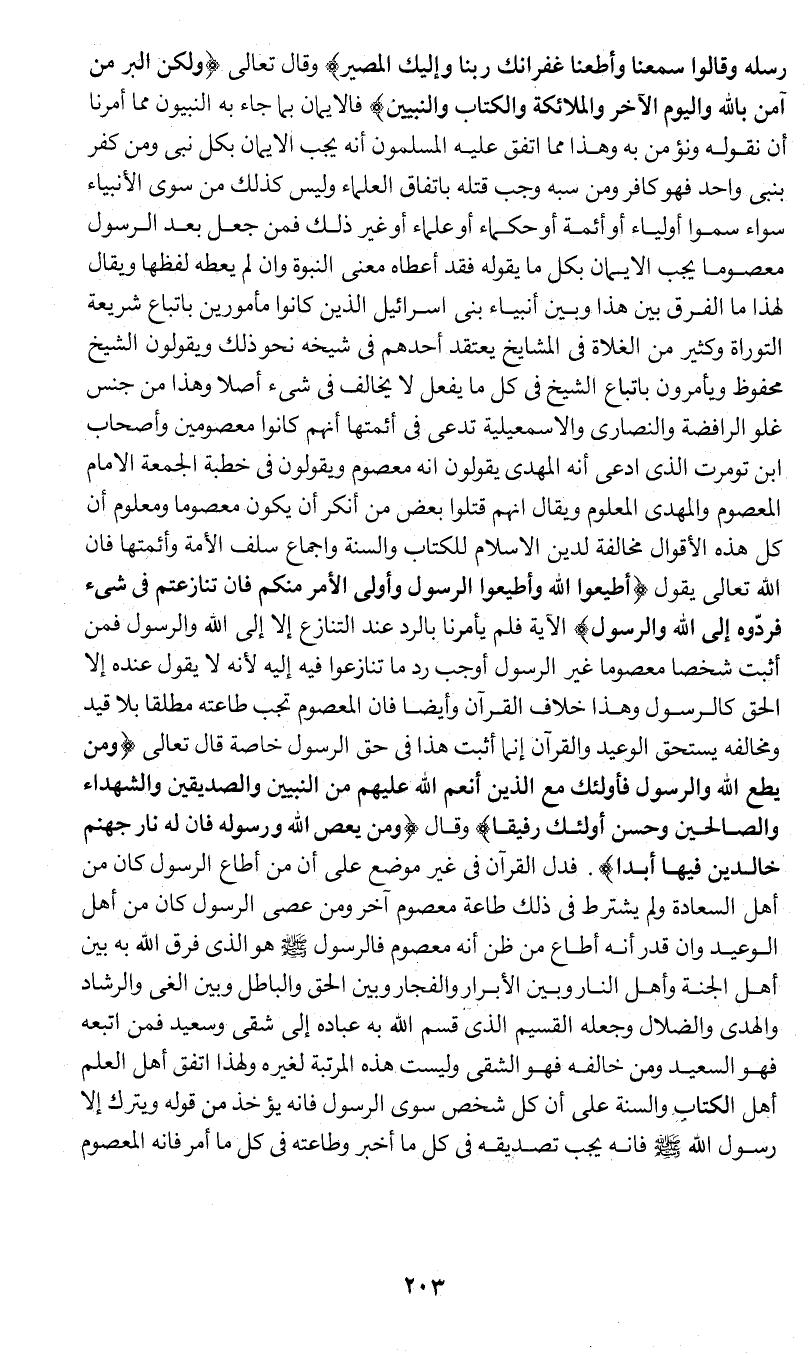 رُّسُلِهِ وَقَالُواْ سَمِعْنَا وَأَطَعْنَا غُفْرَانَكَ رَبَّنَا وَإِلَيْكَ الْمَصِيرُ} وقال تعالى {ولكن البر من آمن بالله واليوم الآخر والملائكة والكتاب والنبيين} فالإيمان بما جاء به النبيون مما أمرنا أن نقوله ونؤمن به وهذا مما اتفق عليه المسلمون أنه يجب الإيمان بكل نبي ومن كفر بنبي واحد فهو كافر ومن سبه وجب قتله باتفاق العلماء وليس كذلك من سوى الأنبياء سواء سموا أولياء أو أئمة أو حكماء أو علماء أو غير ذلك فمن جعل بعد الرسول معصوما يجب الإيمان بكل ما يقول فقد أعطاه معنى النبوة وإن لم يعطه لفظها ويقال لهذا ما الفرق بين هذا وبين أنبياء بني إسرائيل الذين كانوا مأمورين باتباع شريعة التوراة وكثير من الغلاة في المشايخ يعتقد أحدهم في شيخه نحو ذلك ويقولون الشيخ محفوظ ويأمرون باتباع الشيخ في كل ما يفعل لا يخالف في شيء أصلا وهذا من جنس غلو الرافضة والنصارى والإسماعيلية تدعي في أئمتها أنهم كانوا معصومين وأصحاب ابن تومرت الذي ادعى أنه المهدي يقولون أنه معصوم ويقولون في خطبة الجمعة الإمام المعصوم والمهدي المعلوم ويقال أنهم قتلوا بعض من أنكر أن يكون معصوماً ومعلوم أن كل هذه الأقوال مخالفة لدين الإسلام للكتاب والسنة وإجماع سلف الأمة وأئمتها فإن الله تعالى يقول {أطيعوا الله وأطيعوا الرسول وأولي الأمر منكم فإن تنازعتم في شيء فردّوه إلى الله والرسول} الآية فلم يأمرنا بالرد عند التنازع إلا إلى الله والرسول فمن أثبت شخصا معصوما غير الرسول أوجب رد ما تنازعوا فيه إليه لأنه لا يقول عنده إلا الحق كالرسول وهذا خلاف القرآن وأيضا فإن المعصوم تجب طاعته مطلقا بلا قيد ومخالفه يستحق الوعيد والقرآن إنما أثبت هذا في حق الرسول خاصة قال تعالى {ومن يطع الله والرسول فأولئك مع الذين أنعم اله عليهم من النبيين والصديقين والشهداء والصالحين وحسن أولئك رفيقا} وقال {ومن يعص الله ورسوله فإن له