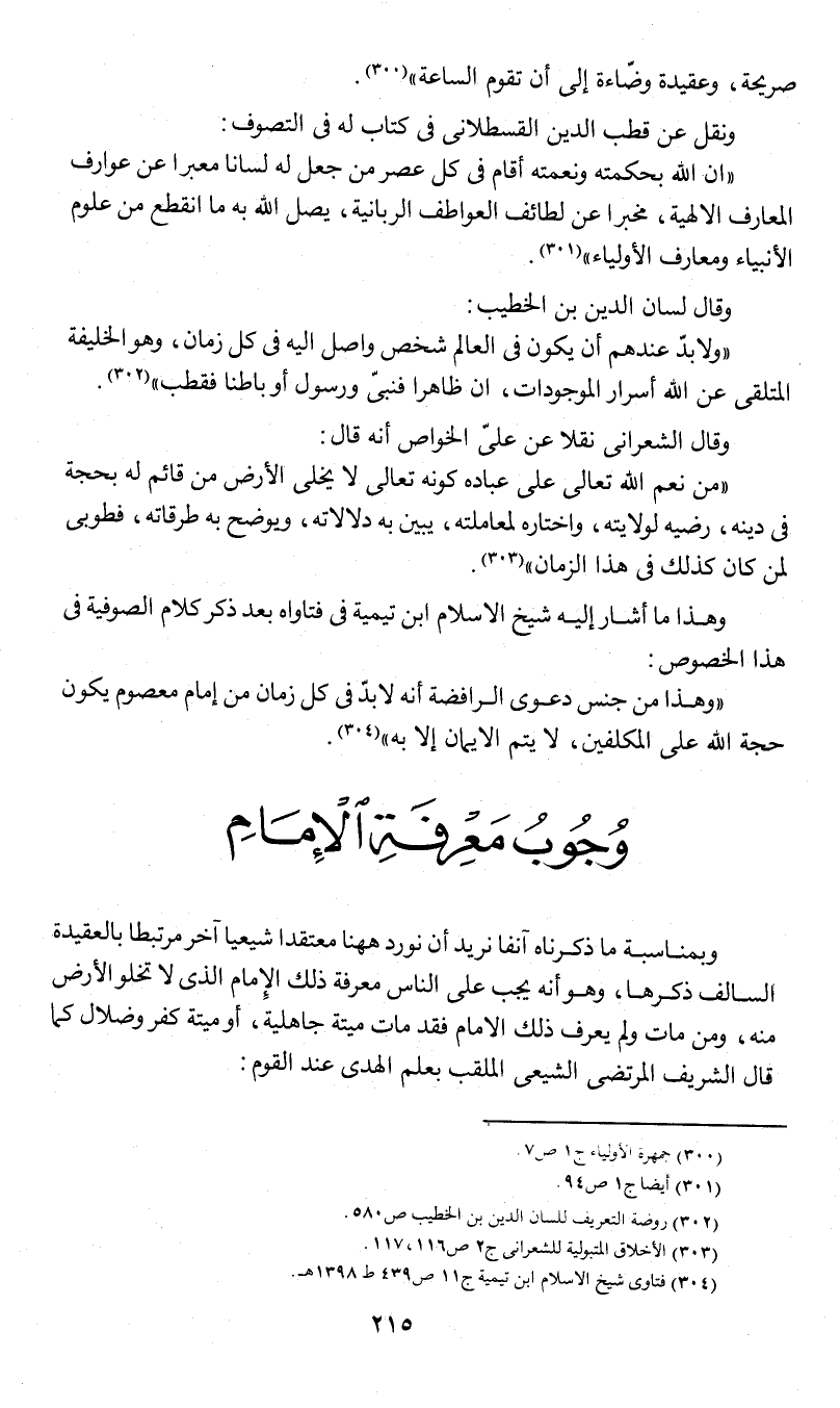 (من نعم الله تعالى على عباده كونه تعالى لا يخلي الأرض من قائم له بحجة في دينه , رضية لولايته , وأختاره لمعاملته , يبين به دلالاته , يوضح به طرقاته , فطوبى لمن كان كذلك في هذا الزمان) (¬4).