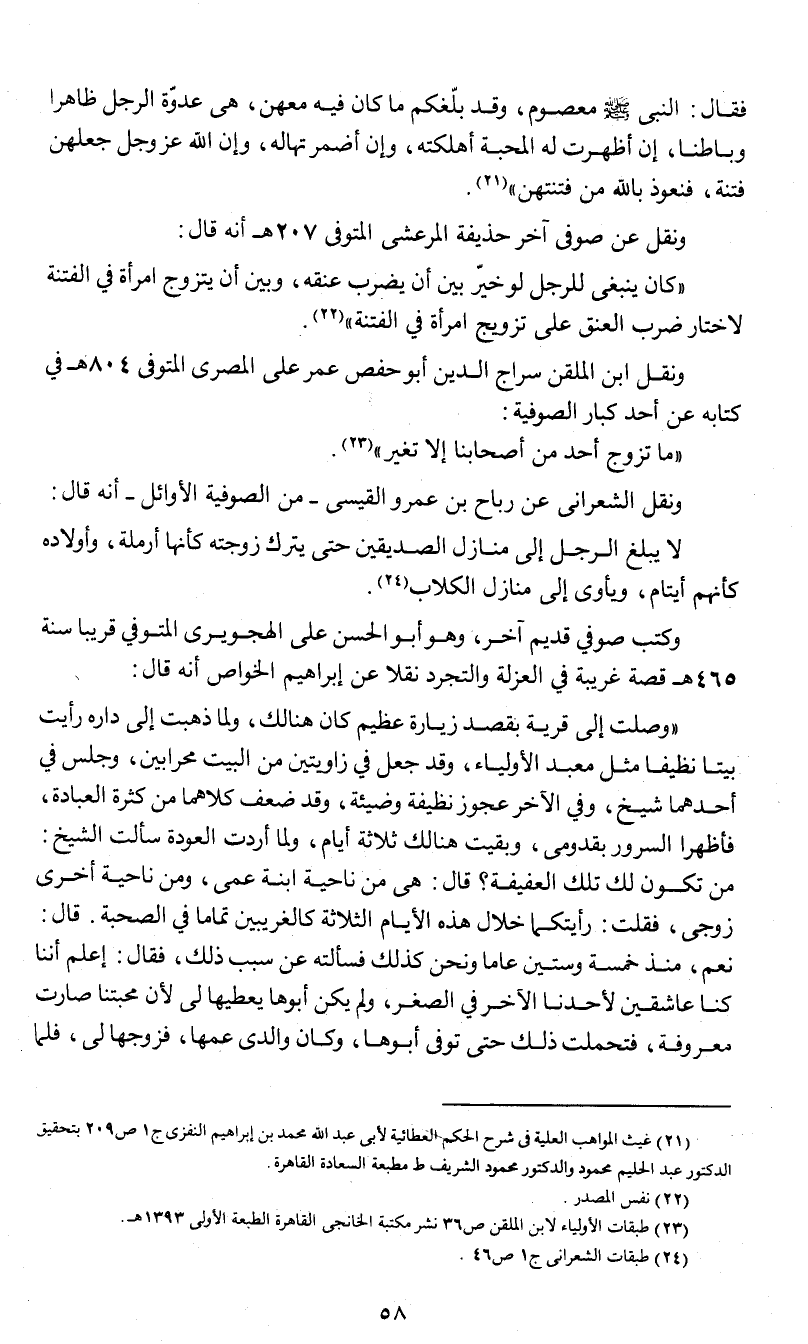 (وصلت إلى قرية بقصد زيارة عظيم كان هنالك , ولما ذهبت إلى داره رأيت بيتا نظيفا مثل معبد الأولياء , وقد جعل في زاويتين من البيت محرابين , وجلس في أحدهما شيخ , وفي الآخر عجوز نظيفة وضيئة , وقد ضعف كلاهما من كثرة العبادة , فأظهر السرور بقدومي , وبقيت هنالك ثلاثة أيام , ولما أردت العودة سألت الشيخ: من تكون لك تلك العفيفة؟ قال: هي من ناحية ابنه عمي , ومن ناحية أخرى زوجي , فقلت: رأيتكما خلال هذه الأيام الثلاثة كالغربيين تماما في الصحبة , قال: نعم , منذ خمسة وستين عاما ونحن كذلك فسألته عن سبب ذلك , فقال: إعلم إننا كنا عاشقين لأحدنا الآخر في الصغر , ولم يكن أبوها يعطيها لي لأن محبتنا صارت معروفة , فتحملت ذلك حتى توفى أبوها , وكان والدي عمها , فزوجها لي , فلما