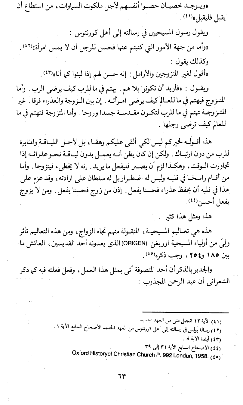 هذه هي تعاليم المسيحية , المنقولة منهم تجاه الزواج , ومن هذه التعاليم تأثر وليّ من أولياء المسيحية اوريغن ( ORIGEN) الذي يعدونه أحد القديسين , العائش ما بين 185 و 254 , وجبَّ ذكره (¬5).