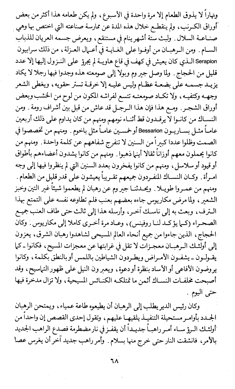 ونهارا لا يذوق الطعام إلا مرة واحدة في الأسبوع , ولم يكن طعامه هذا أكثر من بعض أوراق الكرنب , ولم ينقطع خلال هذه المدة عن ممارسة صناعته التي اختص بها وهي صناعة السلال. ولبث ستة أشهر ينام في مستنقع , ويعرض جسمه العريان للذباب السام. ومن الرهبان من أوفوا على الغاية في أعمال العزلة , من ذلك سرابيون Serapion الذي كان يعيش في كهف في قاع هاوية لم يجرؤ على النزول إليها إلا عدد قليل من الحجاج. ولما وصل جيروم وبولا إلى صومعته هذه وجدوا فيها رجلا لا يكاد يزيد جسمه على بضعة عظام وليس عليه إلا خرقة تستر حقويه , ويغطي الشعر وجهه وكتفيه , ولا تكاد صومعته تتسع لفراشه المكون من لوح من الخشب وبعض أوراق الشجر. ومع هذا فإن هذا الرجل قد عاش من قبل بين أشراف رومة , ومن النساك من كانوا لا يرقدون قط أثناء نومهم ومنهم من كان يداوم على ذلك أربعين عاما مثل بساريون Bessarion أو خمسين عاما مثل باخوم. ومنهم من تخصصوا في الصمت وظلوا عددا كبيرا من السنين لا تنفرج شفاههم عن كلمة واحدة. ومنهم من كانوا يحملون معهم أوزانا ثقالا أينما ذهبوا. ومنهم من كانوا يشدون أعضاءهم بأطواق أو قيود أو سلاسل , ومنهم من كانوا يفخرون بعدد السنين التي لم ينظروا فيها إلى وجه امرأة. وكان النساك المنفردون جميعهم تقريبا يعيشون على قدر قليل من الطعام. ومنهم من عمروا طويلا. ويحدثنا جيروم عن رهبان لم يطعموا شيئا غير التين وخبز الشعير , ولما مرض مكاريوس جاءه بعضهم بعنب فلم تطاوعه نفسه على التمتع بهذا الترف , وبعث به إلى ناسك آخر , وأرسله هذا إلى ثالث حتى طاف العنب جميع الصحراء (كما يؤكد لنا روفينس) , وعاد مرة أخرى كاملا إلى مكاريوس. وكان الحجاج , الذين جاءوا من جميع أنحاء العالم المسيحي لشاهدوا رهبان الشرق , يعزون إلى أولئك الرهبان معجزات لا تقل في غرابتها عن معجزات المسيح , فكانوا - كما يقولون - يشفون الأمراض ويطردون الشياطين باللمس أو بالنطق بكلمة , وكانوا يروضون الأفاعي أو الآساد بنظرة أو دعوة , ويعبرون النيل على ظهور التماسيح , وقد أصبحت مخلفات النساك أثمن ما تملكه الكنائس المسيحية , ولا تزال مدخرة فيها حتى اليوم.