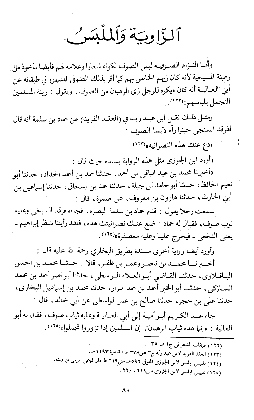 وأما التزام الصوفية لبس الصوف لكونه شعارا وعلامة لهم فأيضا مأخوذ من رهبنة المسيحية لأنه كان زيهم الخاص بهم كما أقر بذلك الصوفي المشهور في طبقاته عن أبي العالية أنه كان (يكره للرجل زي الرهبان من الصوف , ويقول: زينة المسلمين التجمل بلباسهم) (¬1) ز