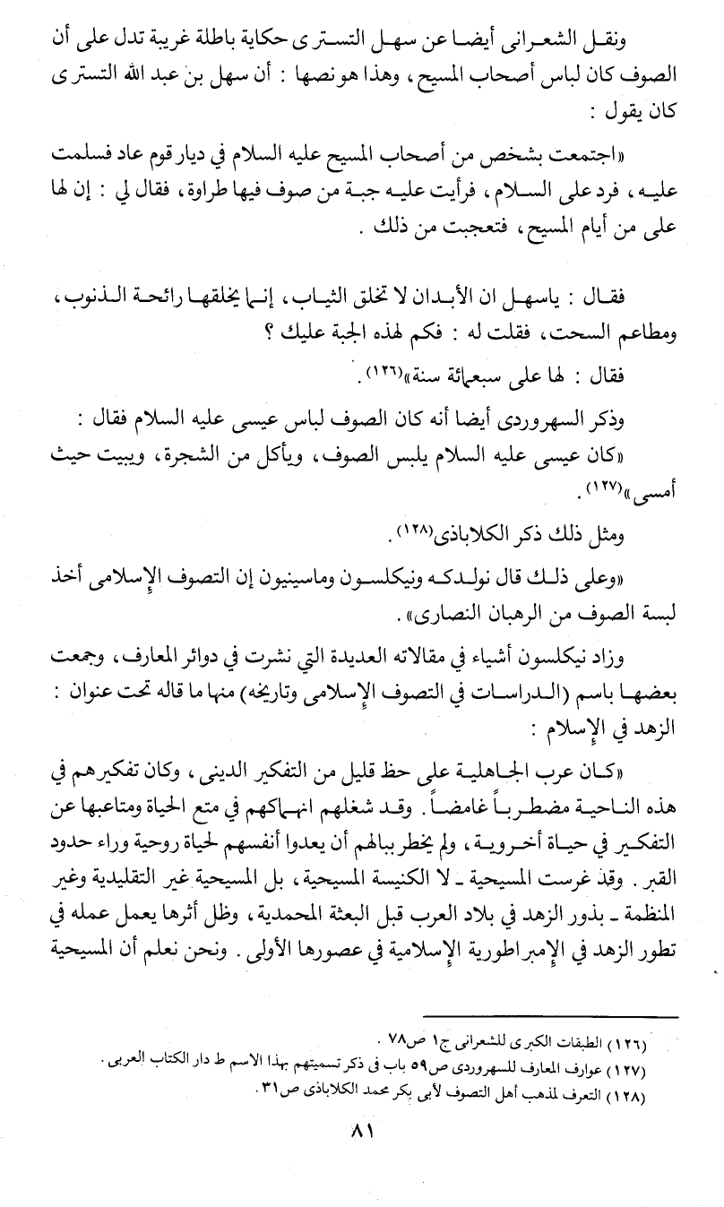 (وعلى ذلك قال نولدكة ونيكلسون وماسينيون إن التصوف الإسلامي أخذ لبسة الصوف من الرهبان النصارى).