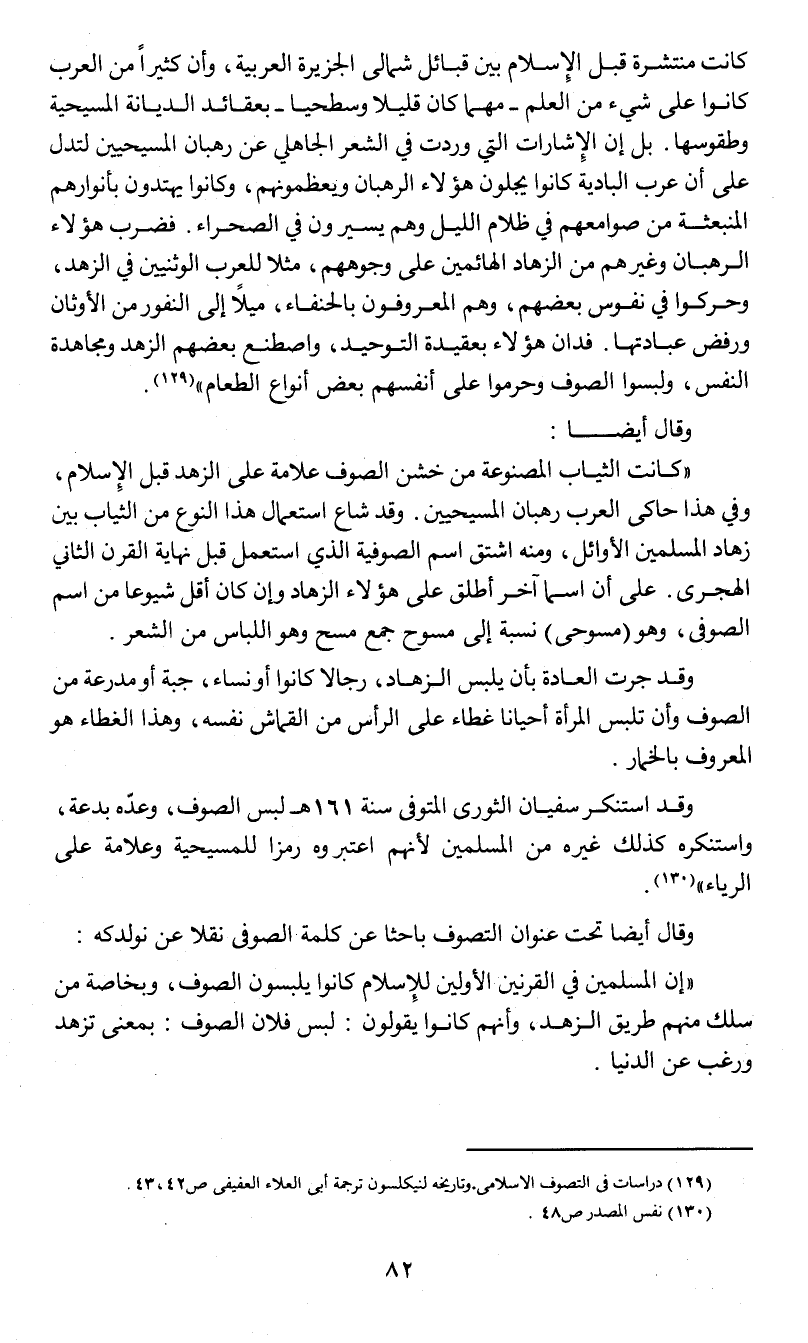 (إن المسلمين في القرنين الأولين للإسلام كانوا يلبسون الصوف , وبخاصة من سلك منهم طريق الزهد , وأنهم كانوا يقولون: لبس فلان الصوف: بمعنى تزهد ورغب عن الدنيا.